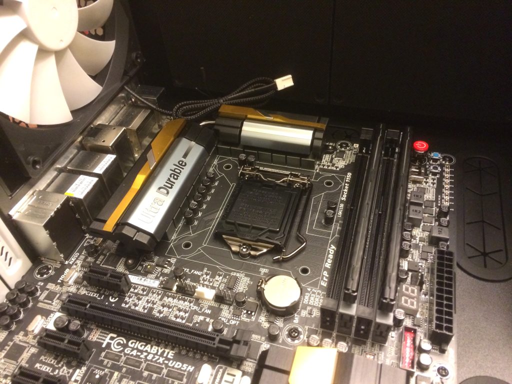 For a motherboard, I chose the Gigabyte GA-Z87X-UD5H Z87 LGA 1150 board. The big thing here is making sure that the LGA numbers matchup between your processor and motherboard. In this case, mine did. This motherboard has support for 10 USB ports, 8 of which are USB 3.0. There’s really not much to say about it, except for the fact that it has plenty of ports and a GUI-based BIOS, which can be seen as positive or negative, depending on your preference. It was a positive for me, being relatively clueless within the BIOS.