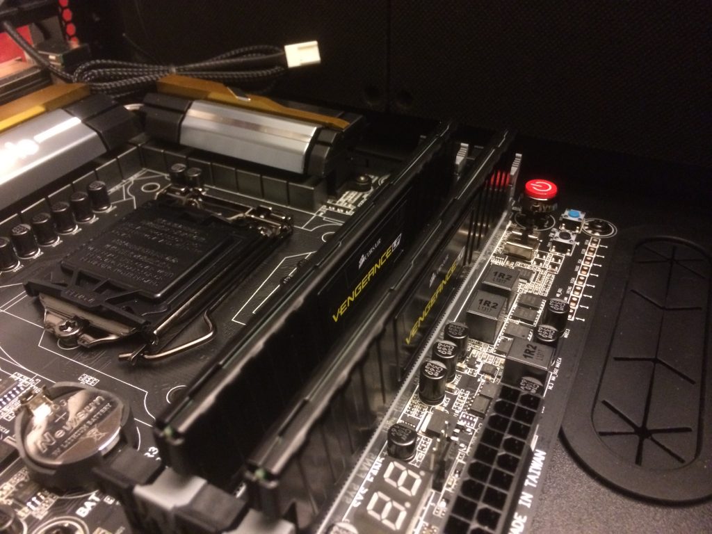 Next, it was time to place the motherboard in the Design Define. This process was relatively straightforward. I first had to put 10 pegs in the bottom of the case. All of the holes were clearly marked and labeled. Then, I simply had to line the motherboard up with those screws, lay it over them, and then screw it into the pegs. Next came installing the RAM, which was incredibly straight forward, as all I had to do was pull back the ends and slide the RAM right into the board.