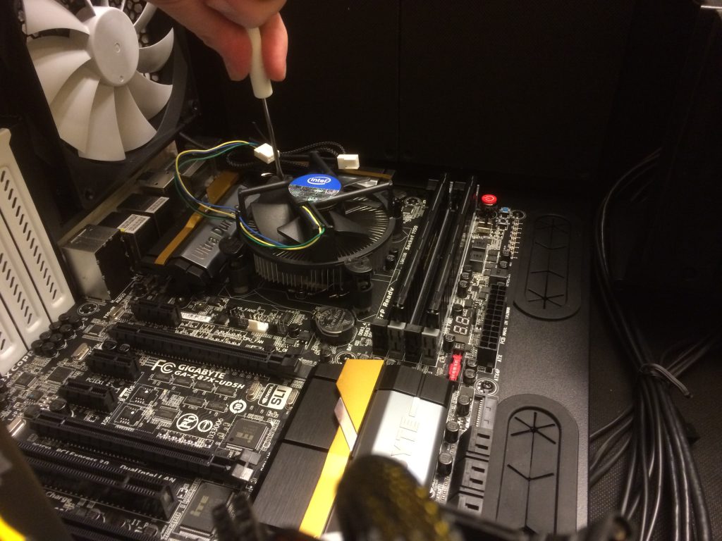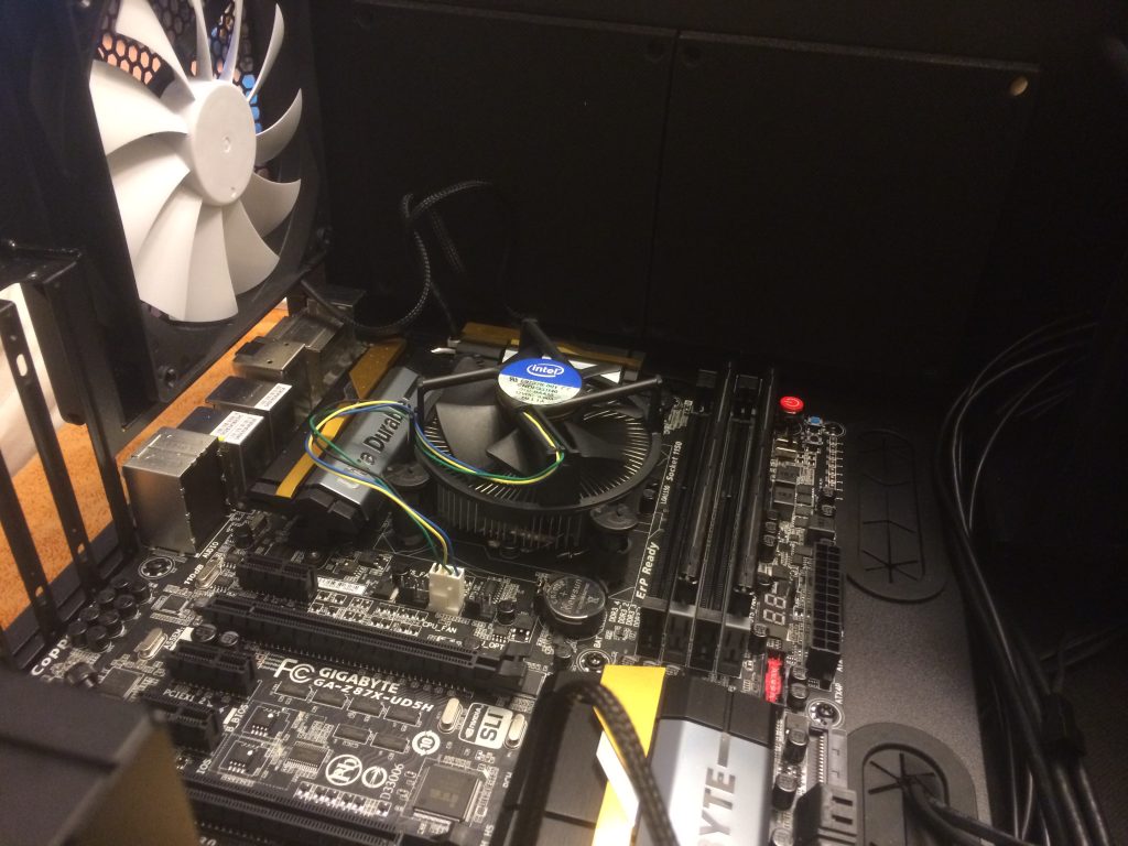 After that I installed the Core i7 processor, which, while the most expensive piece of the build, was also the smallest. After I installed the processor, I placed the included processor fan over it, and tightened it to the motherboard. Then came the task of inserting the graphics card, which intimidated me at first, but actually just involved plugging it into the motherboard and making sure the ports were accessible from the outside of the case.