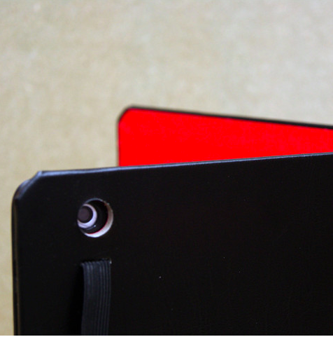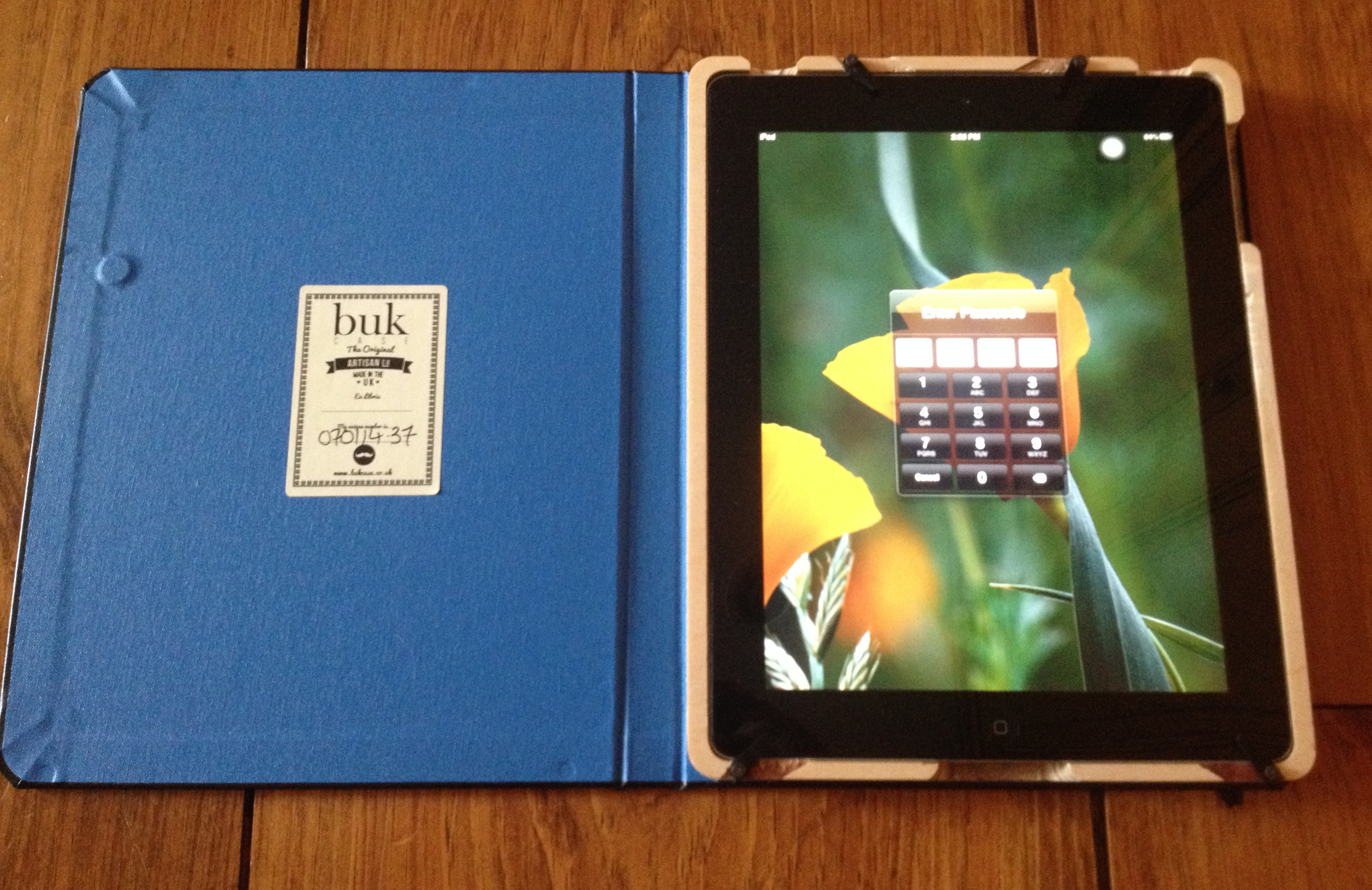 This case is designed to look like an old fashioned book and is made out of Spanish bonded leather. It is a black leather book lined with vinyl that comes in either Skye Blue, Pillarbox Red, or Welsh Slate Grey. On the inside is where you find the unique personal ID number.