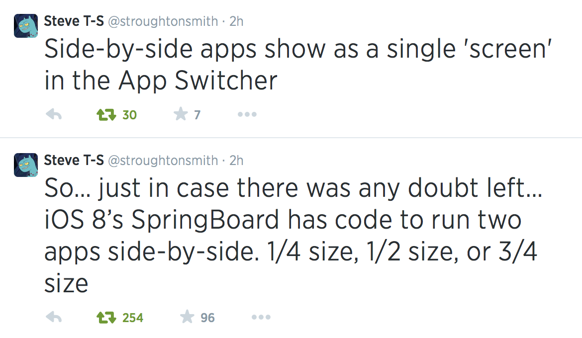 Troughton-Smith explained to us that, based on that above code snippet, Springboard in iOS 8 has support for more than just two apps side-by-side. The interface in testing is dynamic so that one app could take up 3/4 of the screen and the other app 1/4.