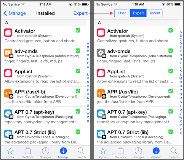 The Simple/Expert toggle that was previously located at the top of the Installed section within the Manage tab has been replaced with an easy selector located at the top of the new Installed section. An additional sorting option has been added, however, which can show you recently installed packages. This could come in handy if you run into a problem after installing a few tweaks and need to nail down which is causing the problem.