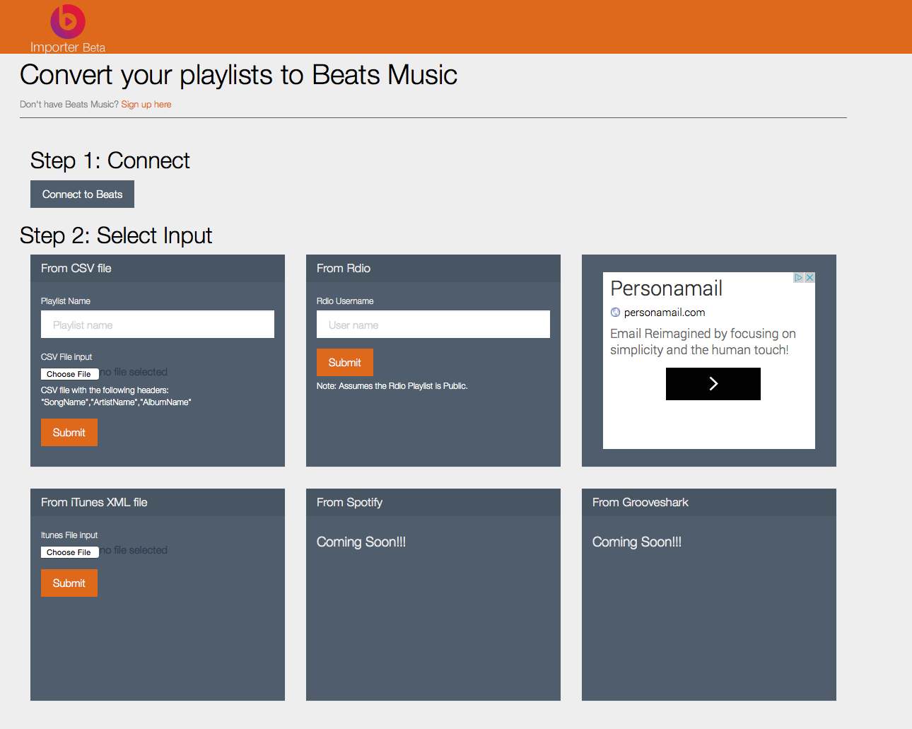 Other Music Services: For those who use Rdio or other music services, the website allows you to import public Rdio Playlists by entering your username or you can import CSV files. Beats Importer says that it is working on solutions for importing songs from both Spotify and Grooveshark to Beats Music.