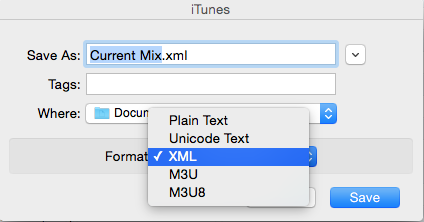 Step 4: In the Export menu, be sure to save the file in the XML format. You should save it to your Desktop for easy access from the Beats Importer website.