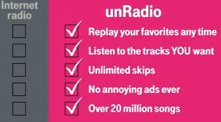 “This new music streaming service is so unlike traditional Internet radio, there was only one possible name for it — unRadio,” said Mike Sievert, Chief Marketing Officer for T-Mobile. “We wanted to do something over the top for our customers, so we teamed up with our friends across town at Rhapsody to do what the Un-carrier does so well — turning convention on its head to benefit our customers.”