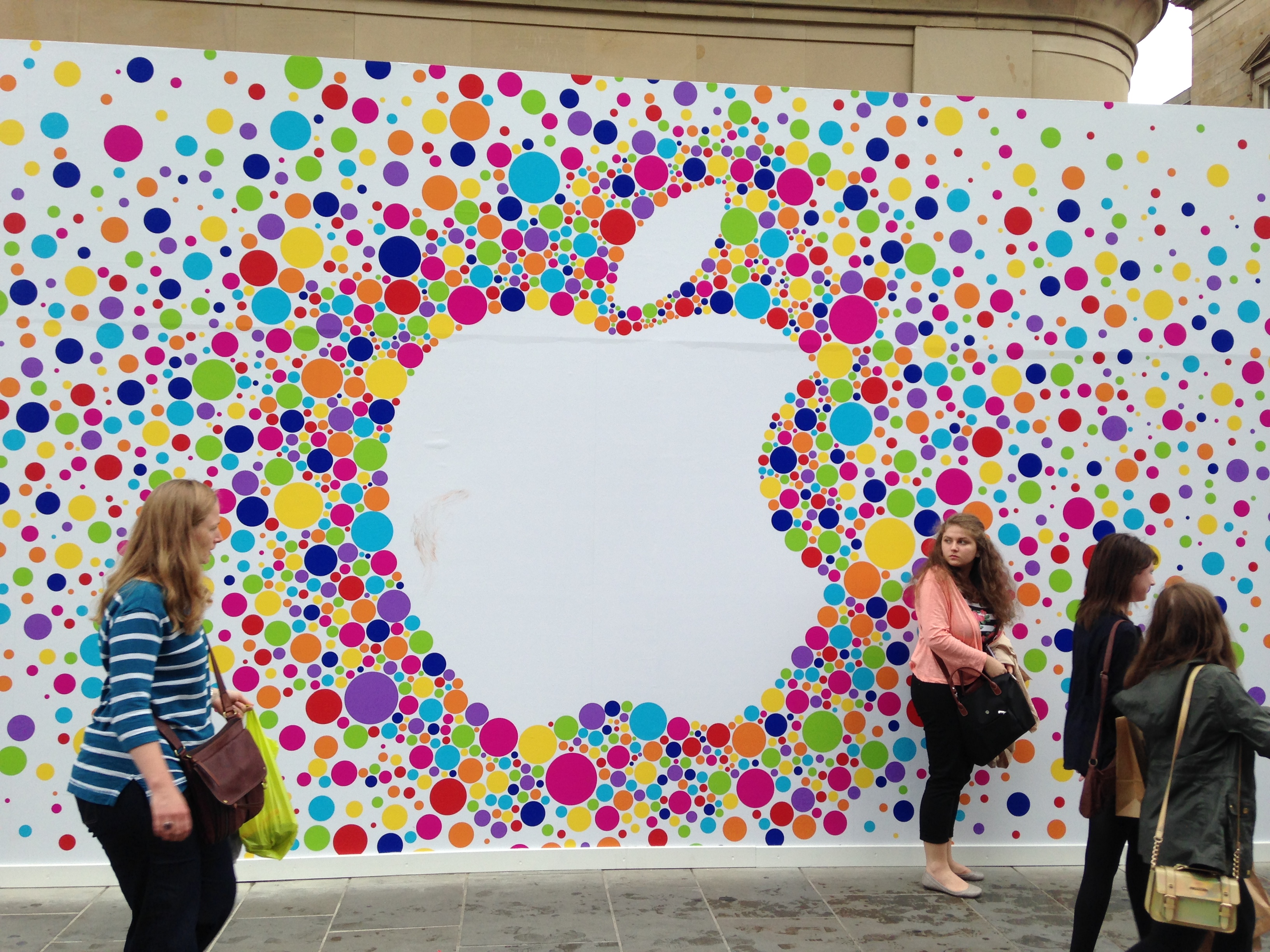 Several readers have sent in photos of Apple promoting the new store with colorful banners (thanks Jan for these images!):