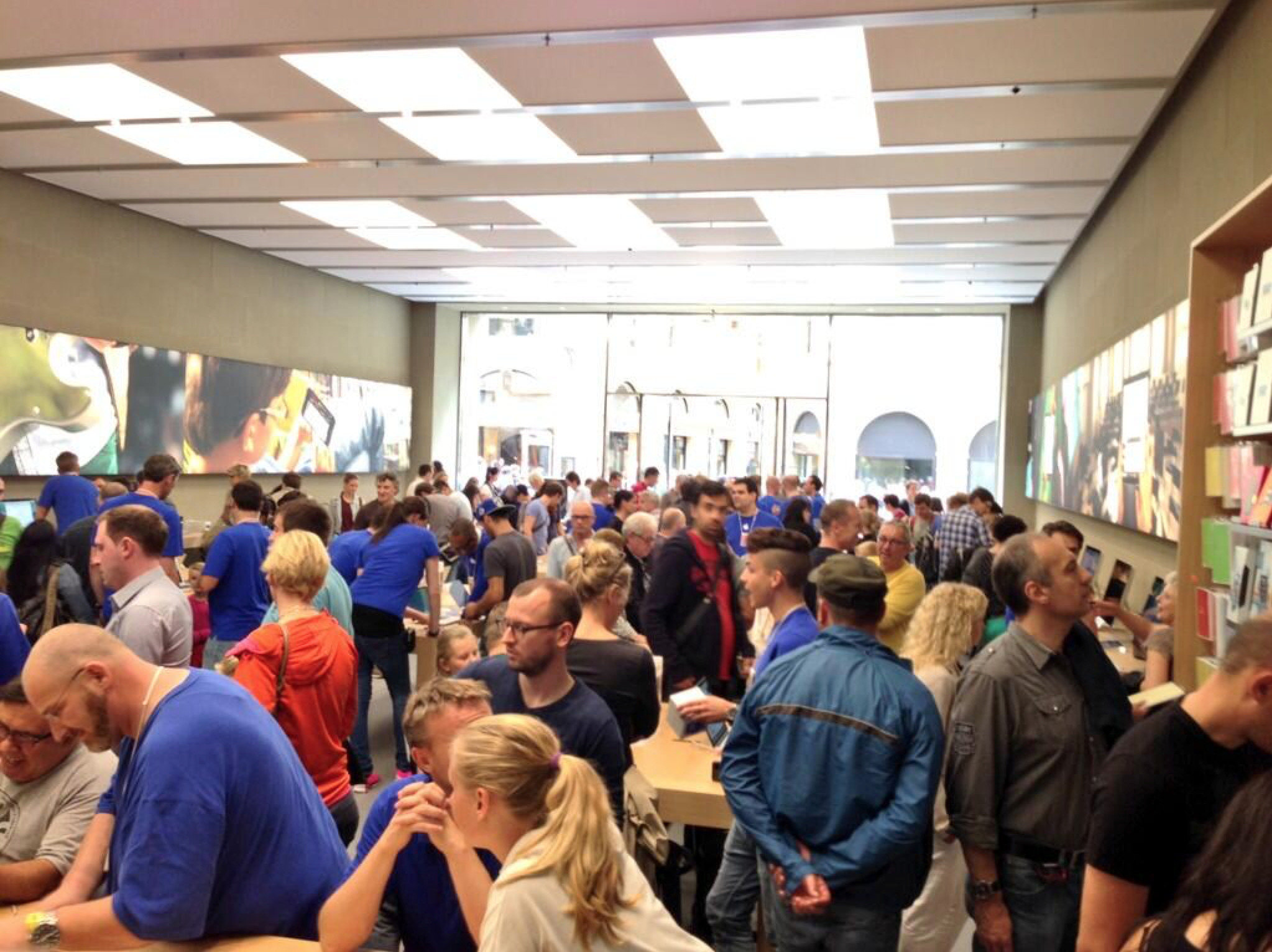 In line with last week’s announcement, Apple’s fourth store in Switzerland opened this weekend in Basel. The store, like most Apple Stores, opened to significant crowds and Apple handed out commemorative shirts to celebrate. The interior of the store appears like most Apple Stores, and the location already has been equipped with the new interior visual design: