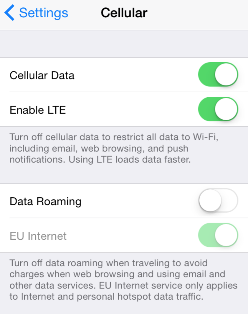 For user from europe. There is additional setup for cellular data. Now is possible to turn on international data only for EU internet :)