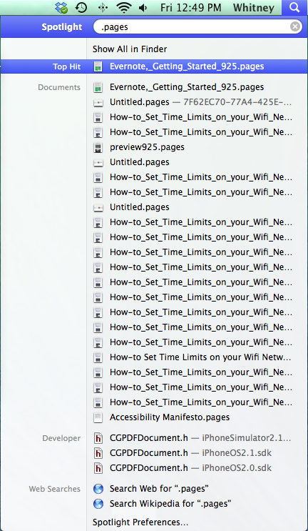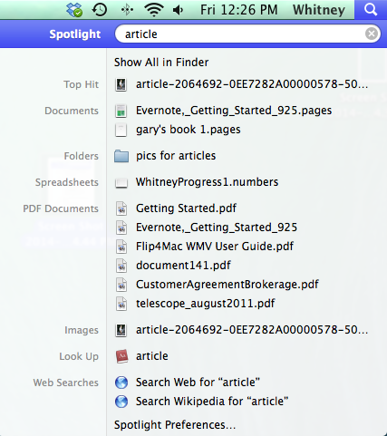 For example, in the search result above, the Documents section displays Evernote,_Getting_Started_925.pages because the word “article” is in the body of the document.