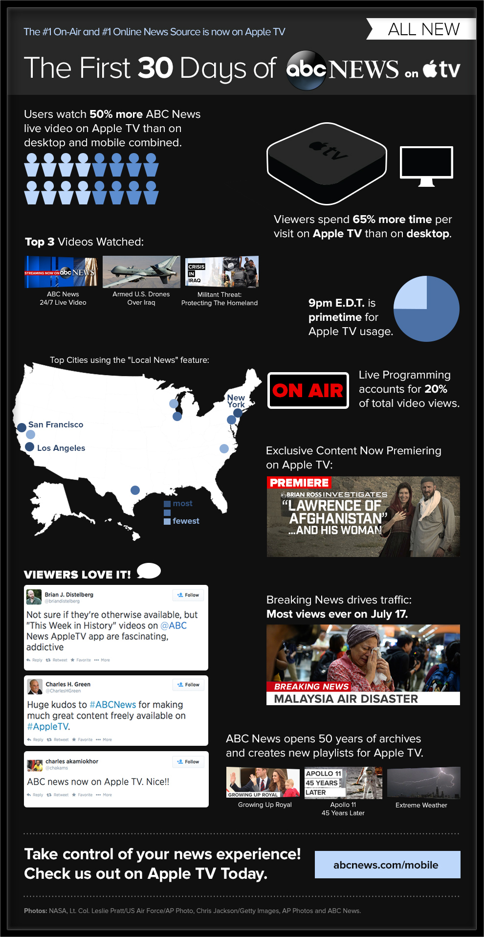 Since Apple TV is still a relatively closed platform only available to select Apple partners, we often don’t hear much on stats in terms of viewers vs other platforms. Today we learn that in the first 30 days of being available on Apple TV, ABC News is experiencing users watching 50% more live video on Apple TV than on desktop and mobile combined. It also says viewers spend 65% more time per visit on Apple TV compared to desktop and that live video streams are making up around 20% of its total video views in the app.