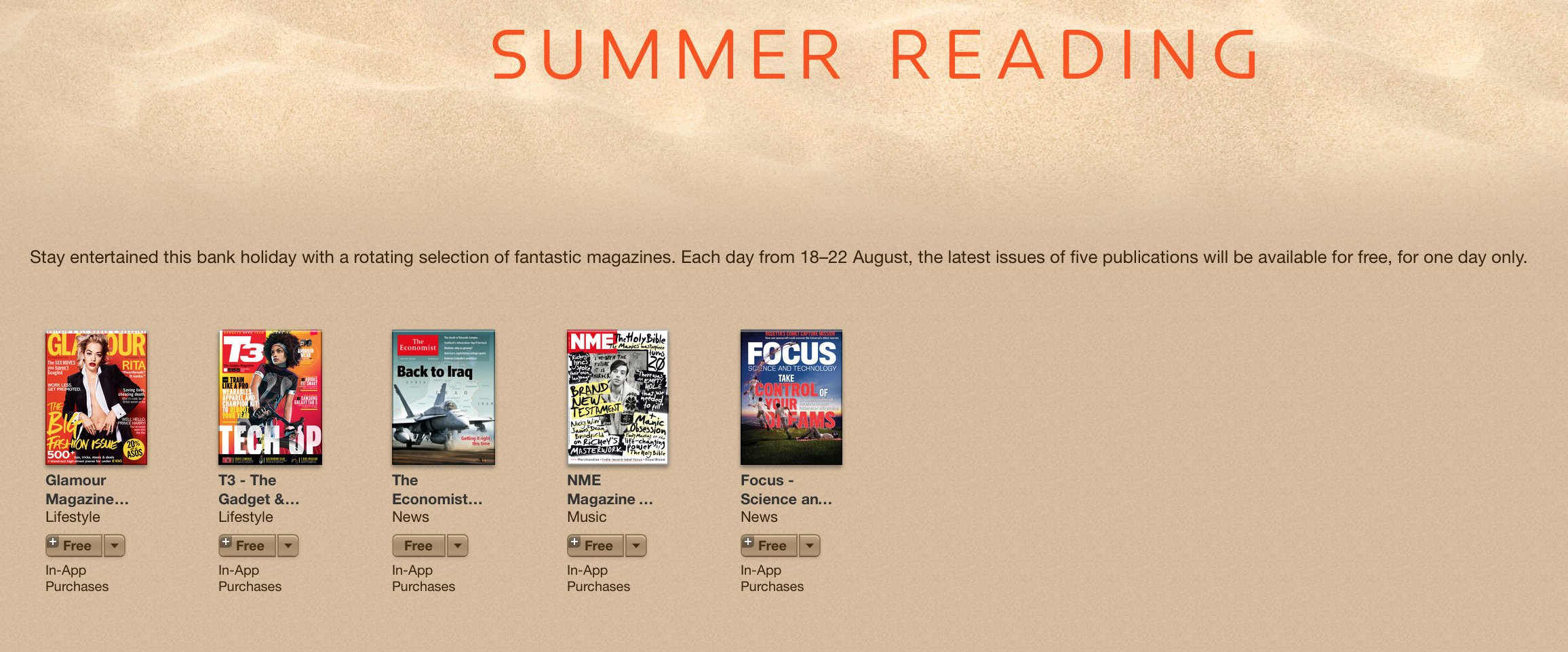 Today’s offerings are from Glamour Magazine, T3 Magazine, The Economist, NME Magazine, and Focus Magazine. You can find the free downloads via iTunes on either the Mac or iOS. Thanks, Dan and everyone else who sent this in!