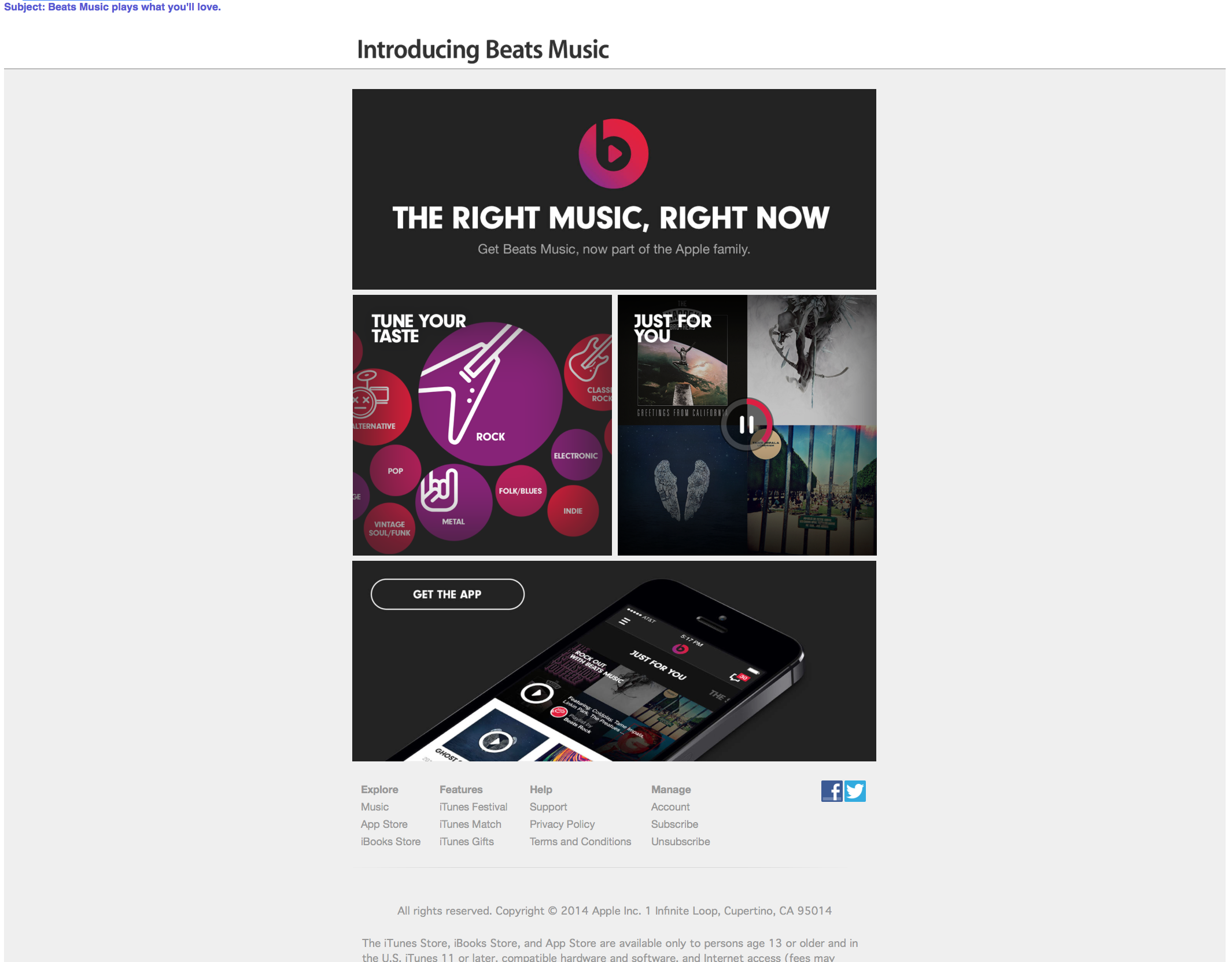 Apple has begun pushing the Beats Music streaming service via email to iTunes customers. The emails promote the free-to-download Beats Music app’s “Just For You” and “Tune Your Taste” features and note that Beats is now “part of the Apple family.” Apple finalized its acquisition of both Beats Music and Beats Electronics at the beginning of this month, and Apple has already begun promoting Beats Electronics via a new section on the online store and notable discounts. This email push is the second Apple promotion of the streaming app as the company has already integrated the app into the App Store’s “Apps by Apple” category. Full email below: