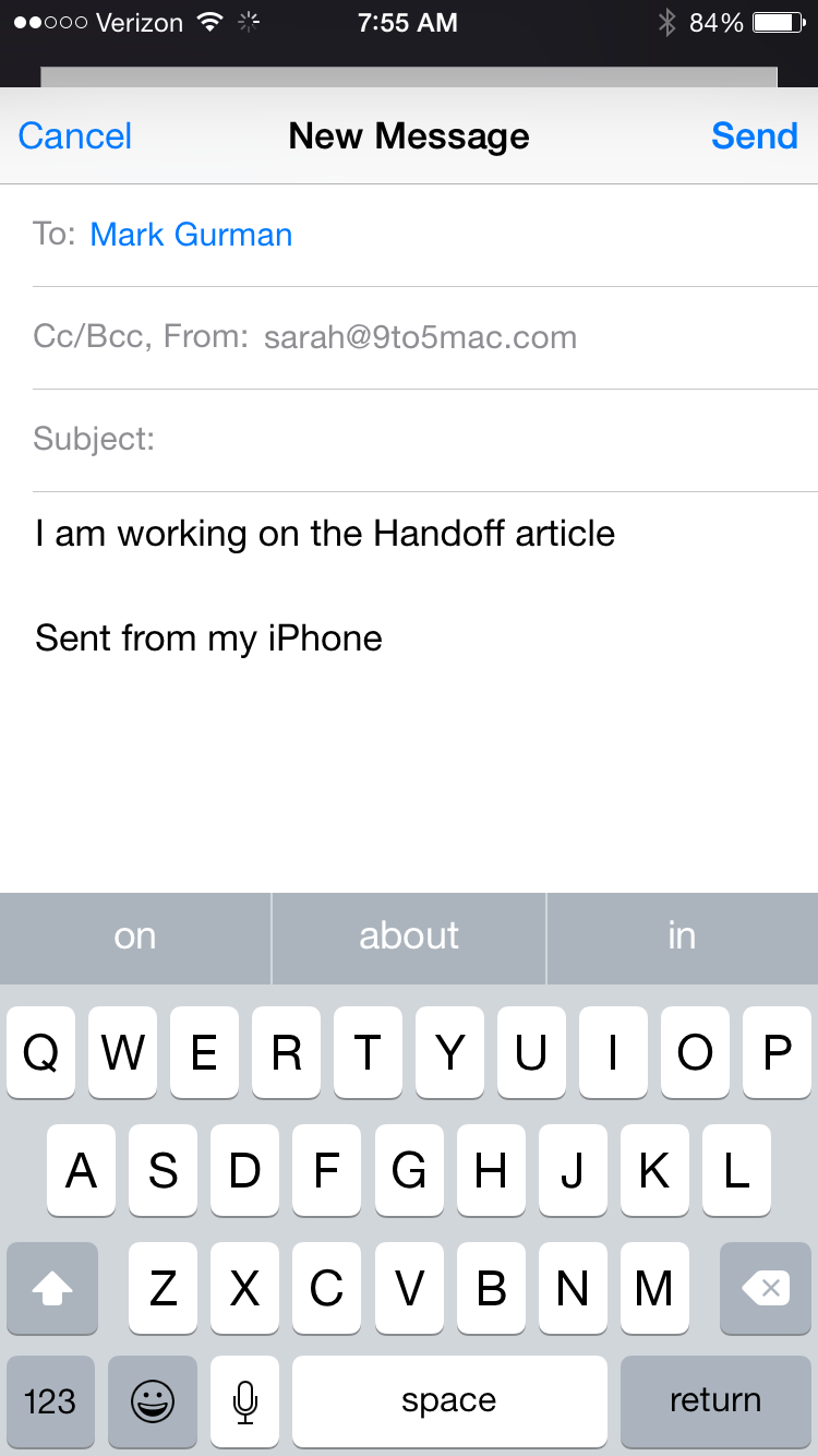 In my other example above, I mentioned you can start writing an email on your iPhone and then finish it on your iPad. Here is the email I am starting to write from my iPhone 6.