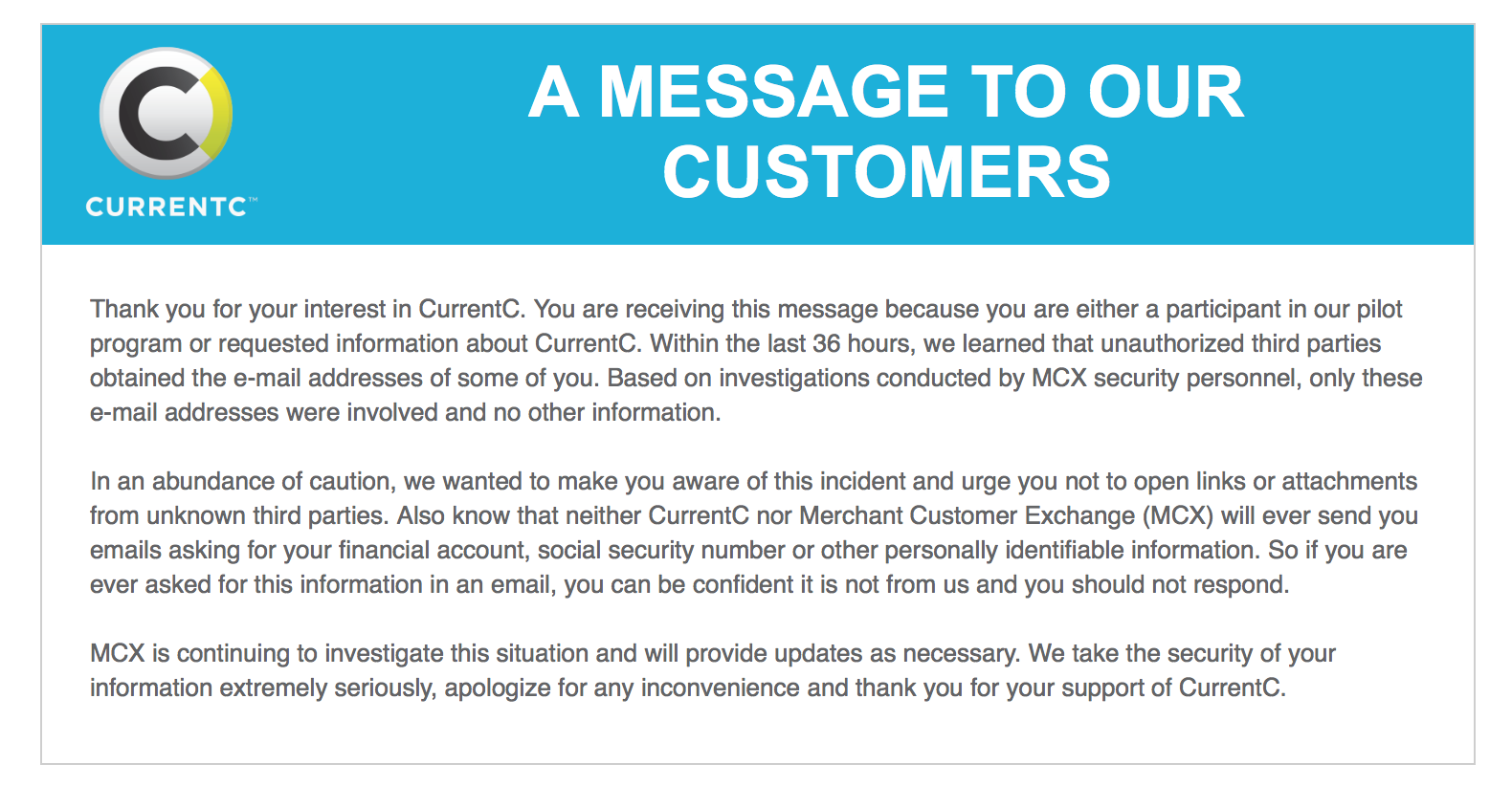 Thank you for your interest in CurrentC. You are receiving this message because you are either a participant in our pilot program or requested information about CurrentC. Within the last 36 hours, we learned that unauthorized third parties obtained the e-mail addresses of some of you. Based on investigations conducted by MCX security personnel, only these e-mail addresses were involved and no other information.