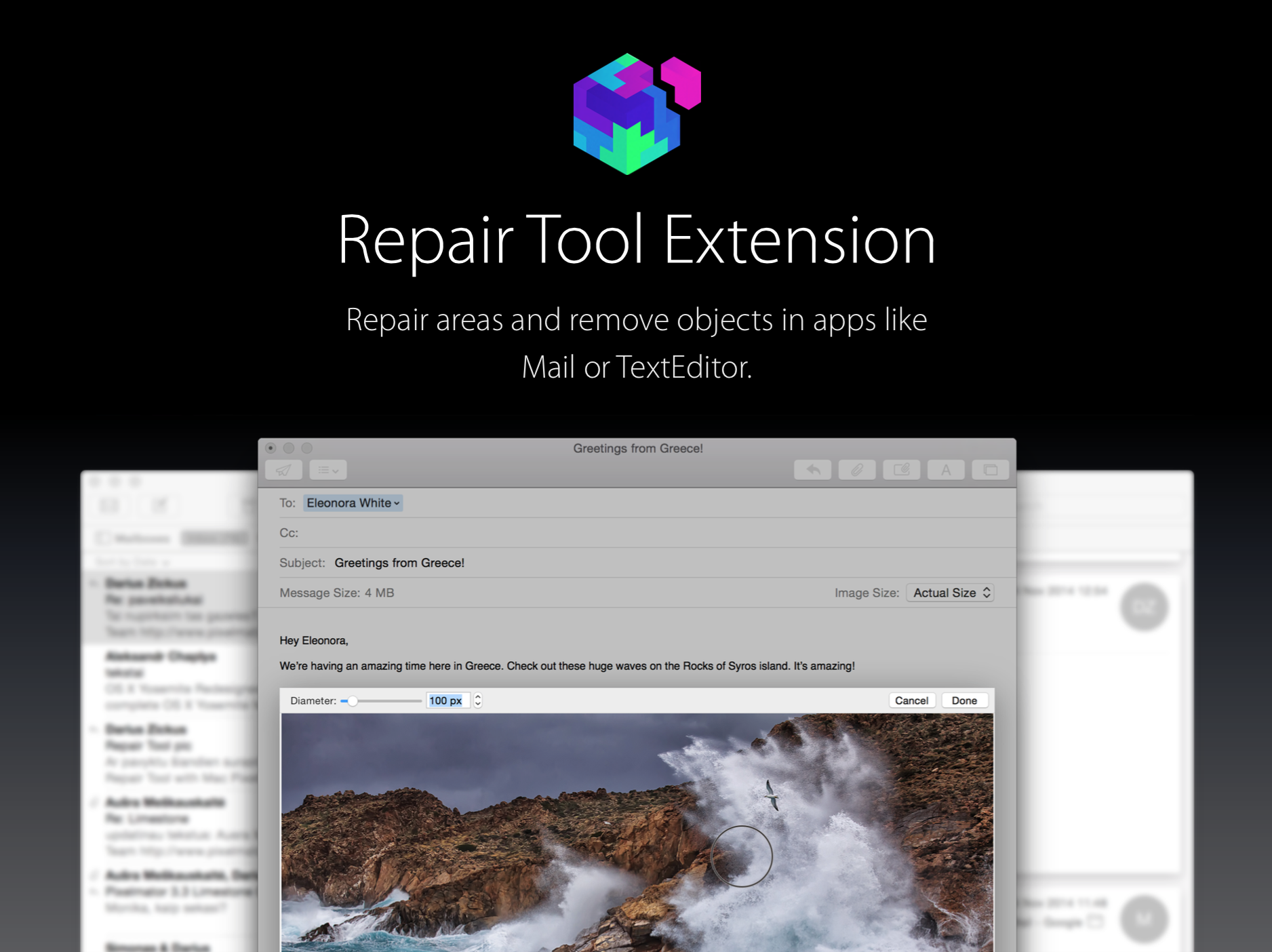 Interestingly, the app also embeds an app extension exposing Pixelmator’s Repair Tool technology across the system in other apps. This means you can quickly edit images in Mail or TextEdit, for example, to remove unwanted objects from a scene.