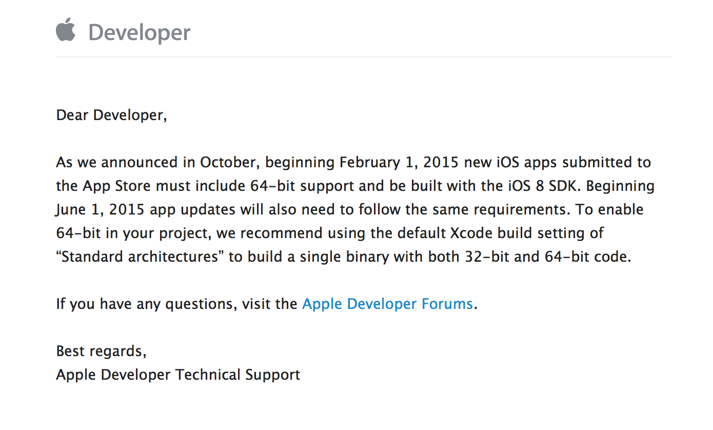 Apple had previously announced that developers of new apps must support 64-bit architectures (to take full advantage of the A7 and A8 technology) by February 1st, 2015. Today, Apple has reminded developers of this deadline as well as clarifying the situation for existing apps.