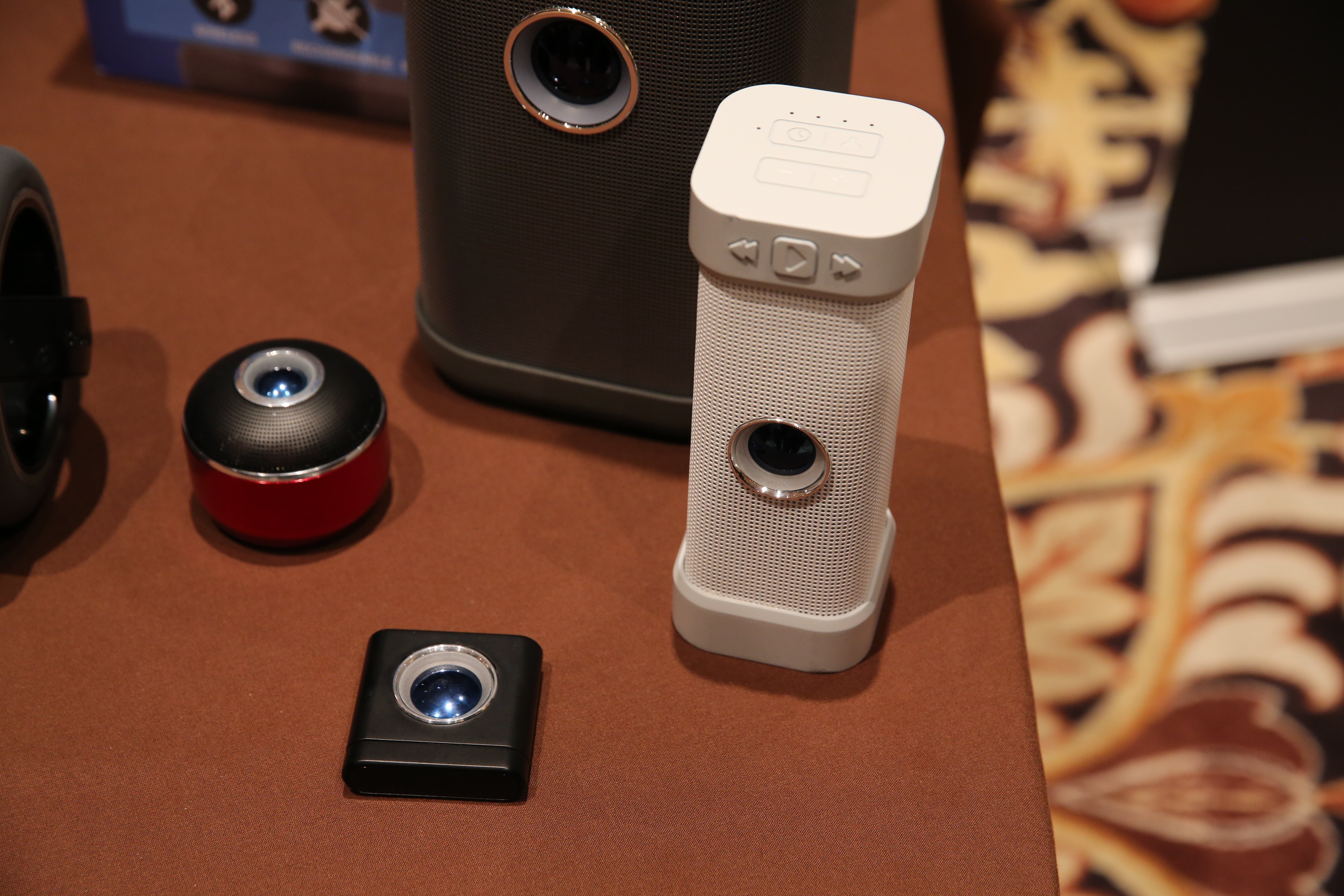 Brookstone showed the latest versions of its Big Blue speakers: the Big Blue Splash ($160, shown in white) is a waterproof speaker with styling reminiscent of its Big Blue Party, only much smaller, while Baby Blue ($70, shown in red) is a single-driver speaker in the smallest enclosure yet released for the family. Intriguingly, Big Blue Button ($70, shown in black) is a Bluetooth distribution device that splits one Bluetooth signal into separate left and right channels, then pairs with your choice of multiple Bluetooth speakers to rebroadcast the sound in wide stereo.