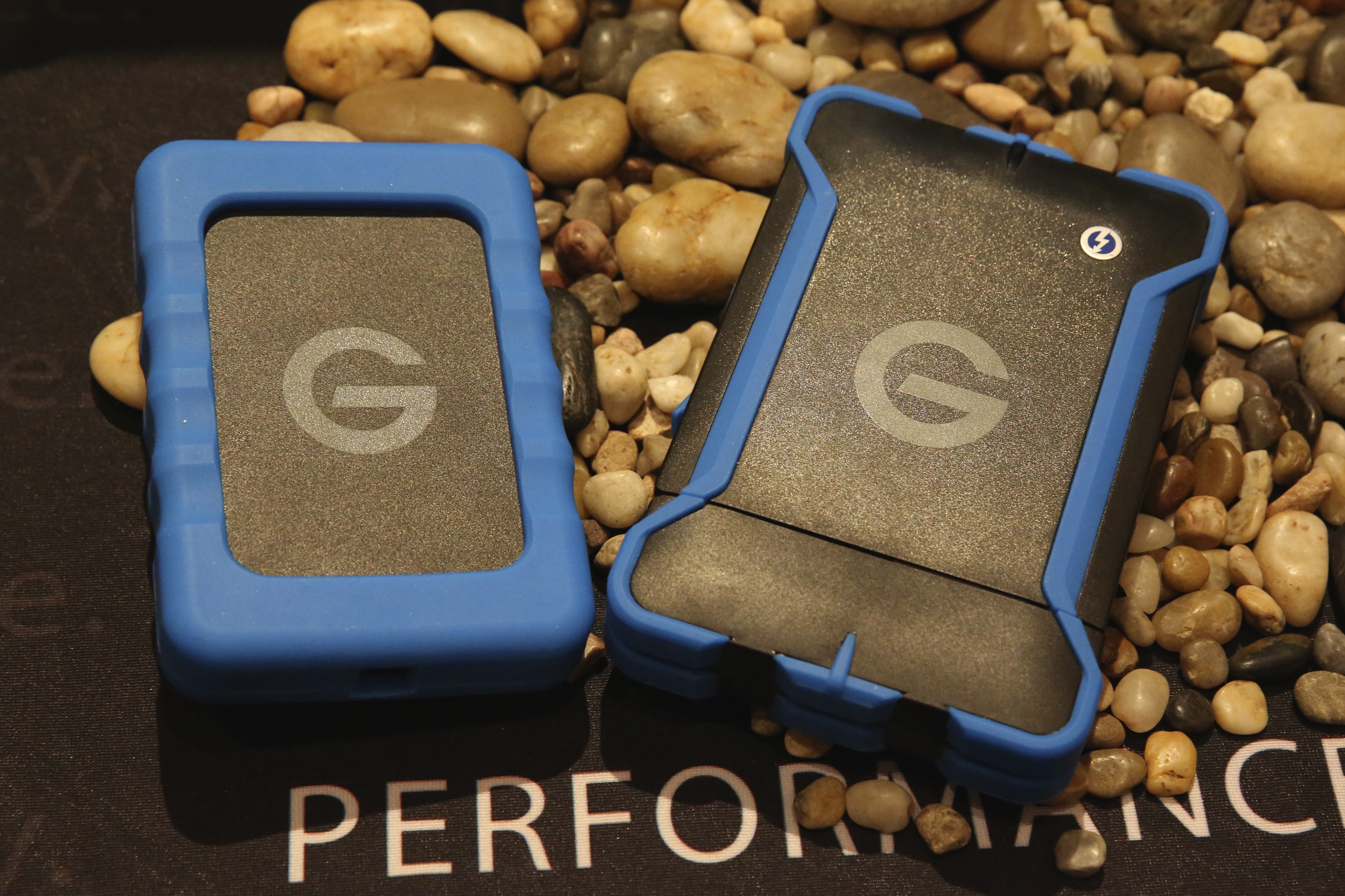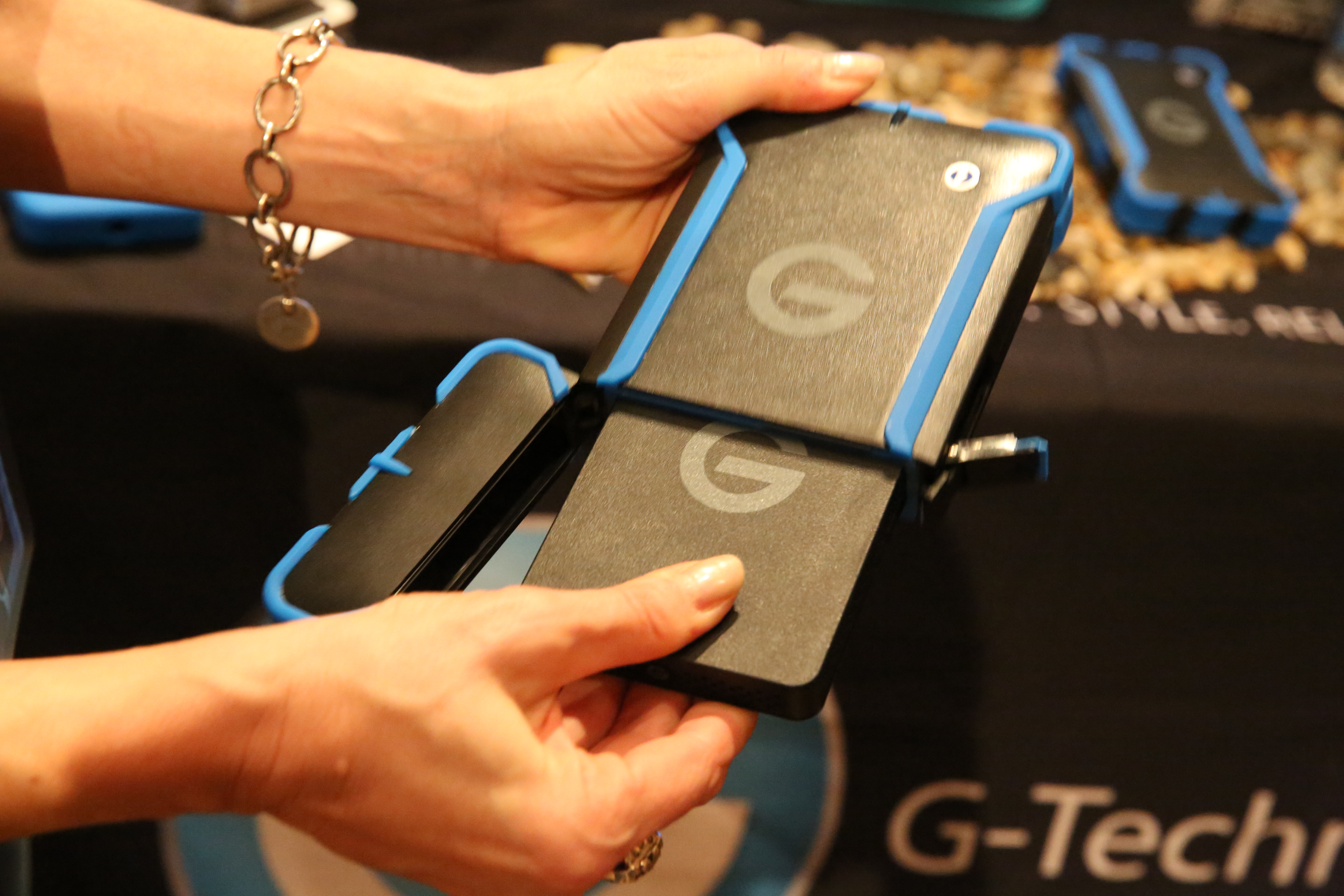 G-Technology, the Western Digital/Hitachi GST brand responsible for cool Mac-ready storage solutions, showed three new “rugged family” drives: ev ATC (1TB) is available in USB 3 ($180) or Thunderbolt ($230) versions, each shipped with a case capable of being dropped from 6 feet heights, submerged in water, and run over by cars. ev RaW (500GB/1TB, $100-$130) is a USB 3/SATA drive with a simpler rubber frame that enables it to withstand roughly 4.5-foot drops. They’re departures for the company, which traditionally has focused on all-aluminum enclosures but recently shifted somewhat to plastics in making Mac Pro-matching RAID drives.