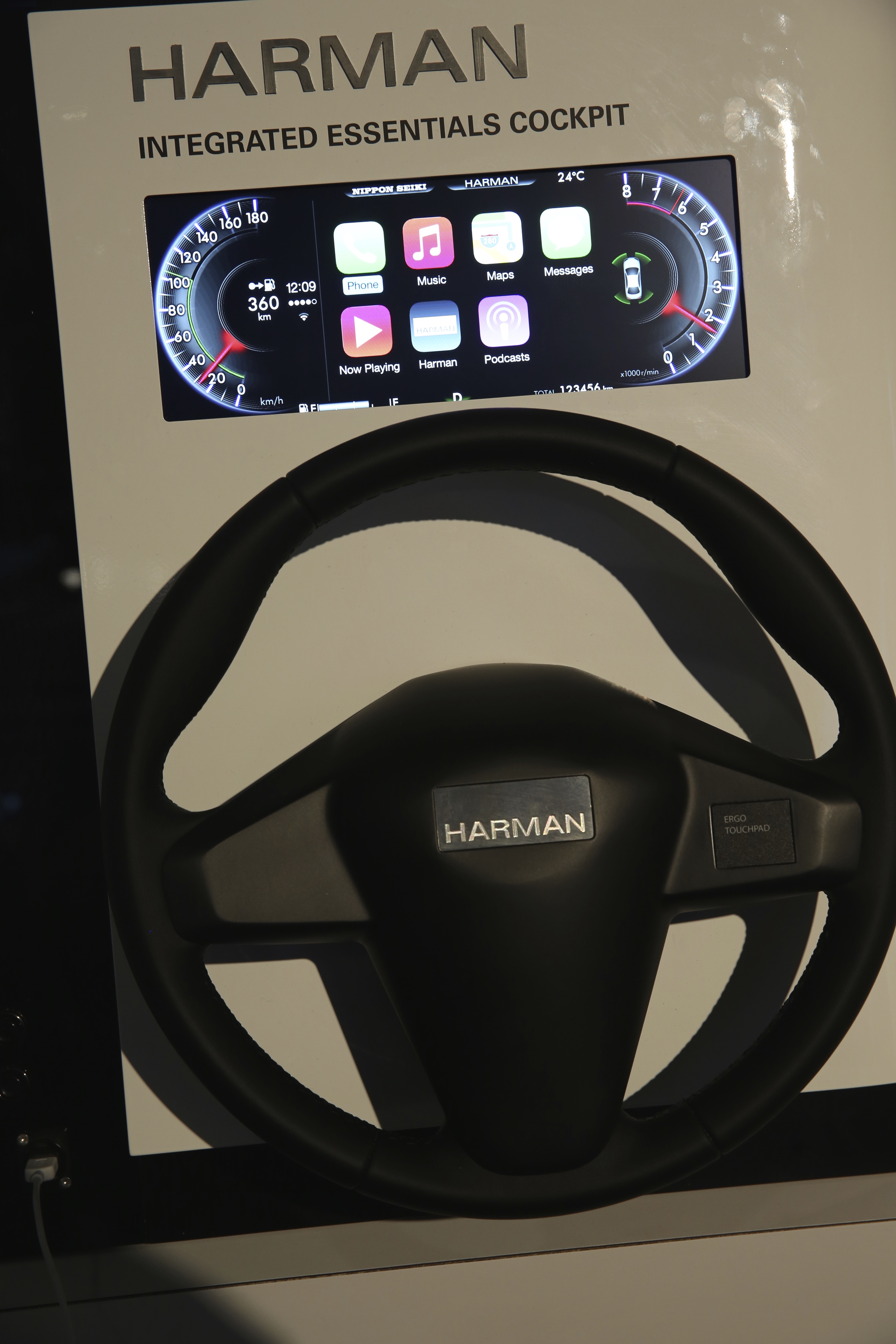Demonstrating how Apple’s CarPlay will be integrated into upcoming budget vehicles, Harman has shown the Integrated Essentials Cockpit, a new OEM solution that does away with direct touchscreen interaction in favor of a steering wheel-mounted touchpad. The Integrated Essentials Cockpit eliminates the currently popular center console-mounted screen, instead bringing Apple’s CarPlay interface directly into the dashboard behind the steering wheel.