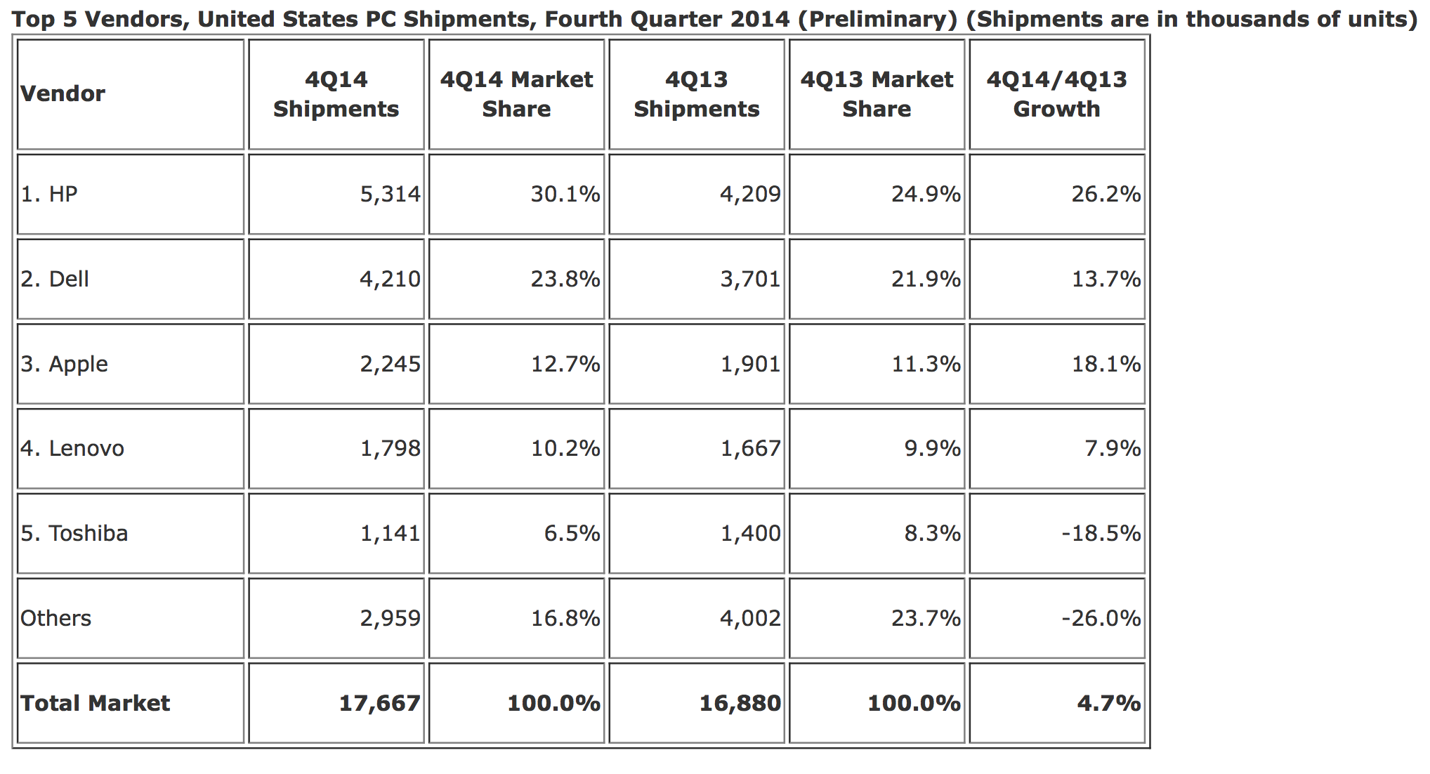 According to the chart above, provided by IDC, the total amount of PCs sold during the quarter amounted to just over 80 million units. This 80 million number is just a piece of the projected total of 308 million PCs sold during the entire span of 2014. Lenovo still ranks as the number 1 PC vendor in terms of unit sales, with HP, Dell, Acer, and Apple (in order) rounding out the top 5. While Apple is the 5th on the list for global sales, the Cupertino-based company ranks as high as number 3 in the rankings specific to the United States.