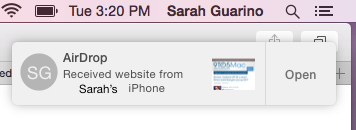 When you press on the person you want to AirDrop the item with, a blue circle appears around their picture and the word Sent appears in blue below their name. On the computer, the person receives a notification in Notification Center alerting them they are receiving an item. It shows them who sent it, as well as a tiny thumbnail preview of what it is that was sent. Even though there is an Open button to press that is displayed temporarily. Depending on what the item is the computer either automatically opens it, or downloads the item and puts it in the Downloads folder such as for pictures and documents.