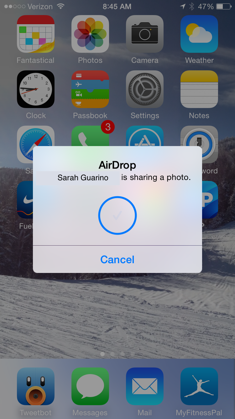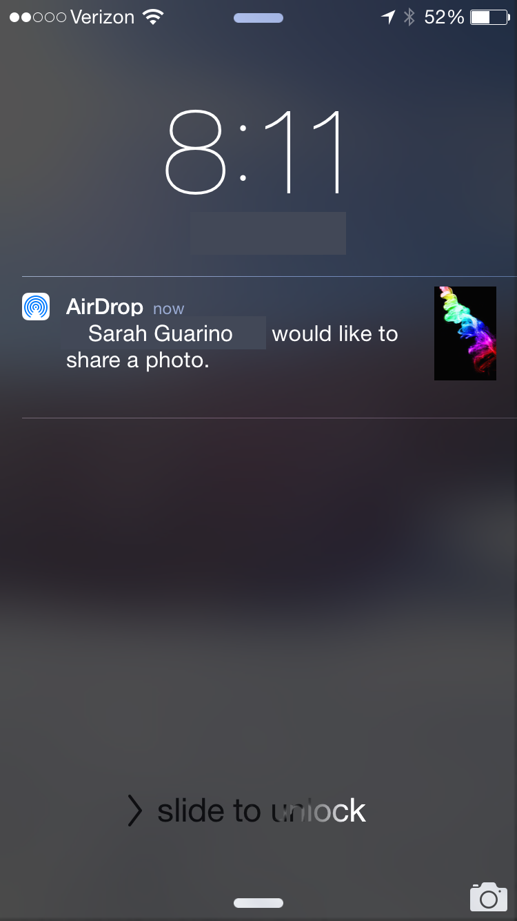 When you press on the person you want to AirDrop the item with, the word Sent appears below their name. On the iOS device’s lock screen , the person receives a notification alerting them they are receiving an item. It shows them who sent it, as well as a tiny thumbnail preview of what it is that was sent. The iOS device automatically opens the picture and saves it to the Photos app.
