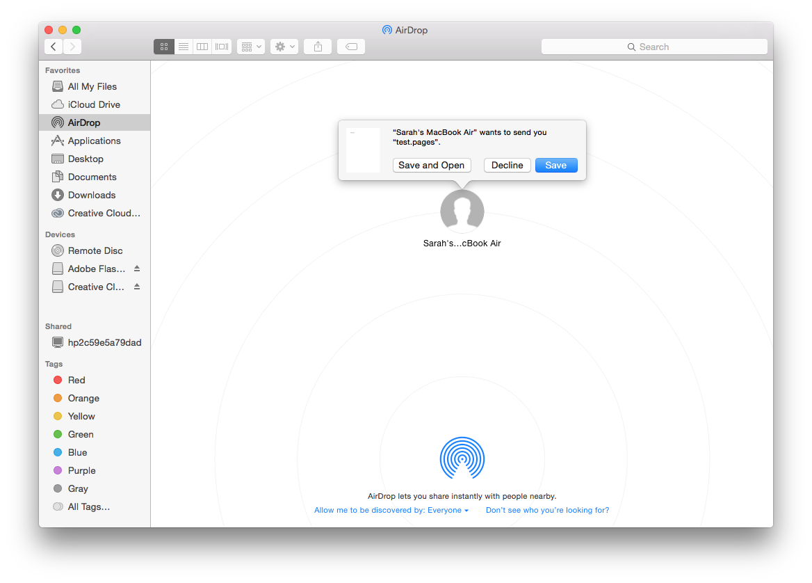 When you are using AirDrop on Macs that are from 2012 or newer and both running Yosemite, they are using BT LE and peer-to-peer Wi-Fi. It works the same method as using AirDrop to share from a Mac to an iOS device. The only thing different is that the recipient does have to have Finder open, with AirDrop selected on the left hand side. When the recipient receives a file via AirDrop they have the option to Save and Open, Decline or just Save the file.