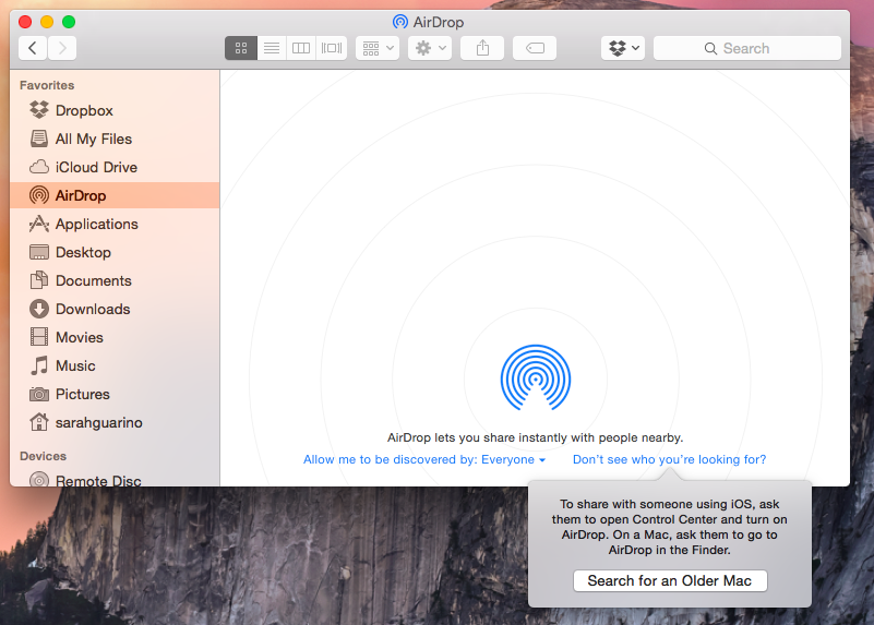 First you want to be on the newer Mac that is running Yosemite and have Finder open with AirDrop selected on the left hand side. Then you are going to click on Don’t see who you’re looking for, down on the bottom in blue.
