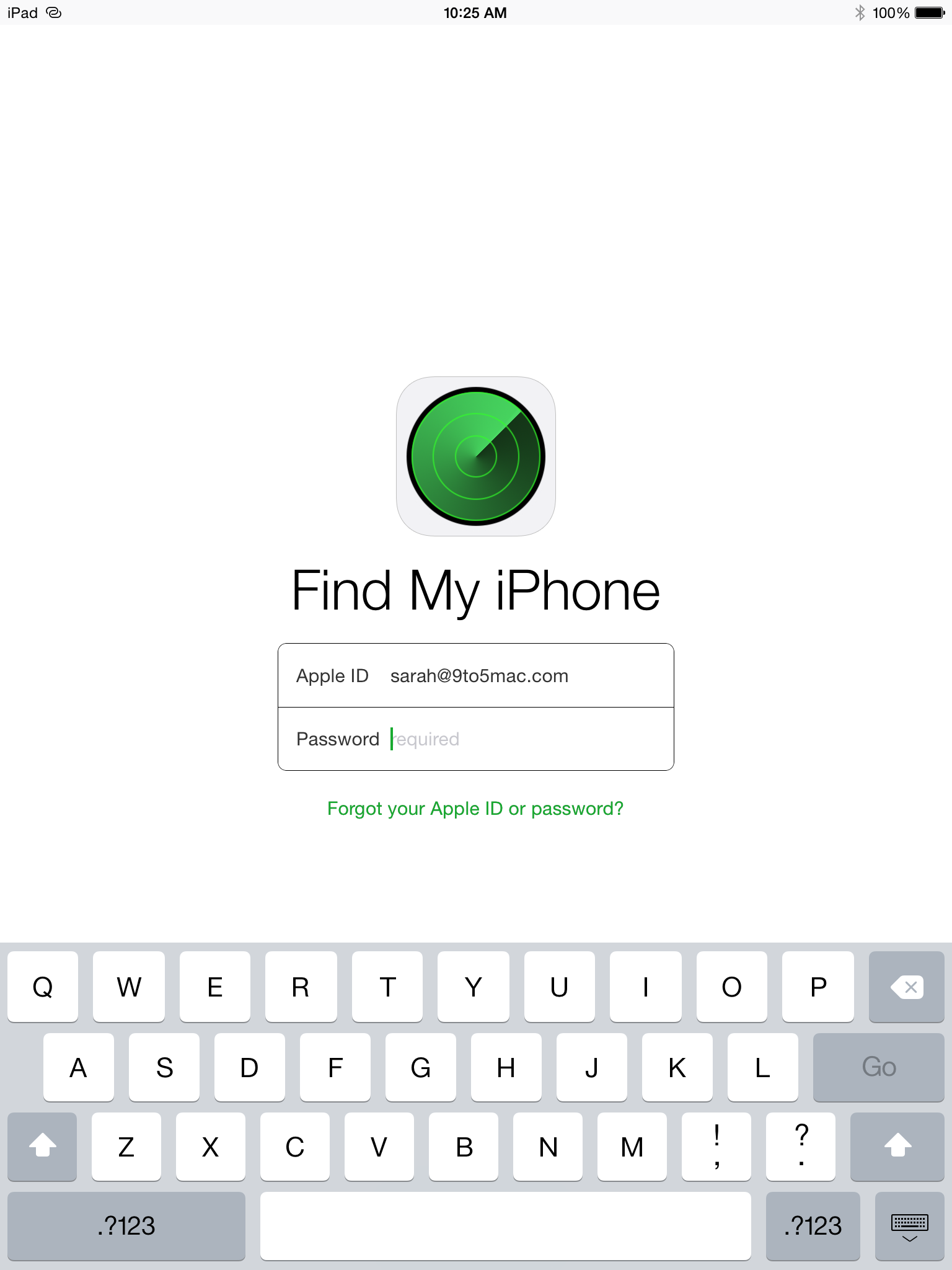 On the iOS device, open up the Find My iPhone app and sign in with your Apple ID and password.