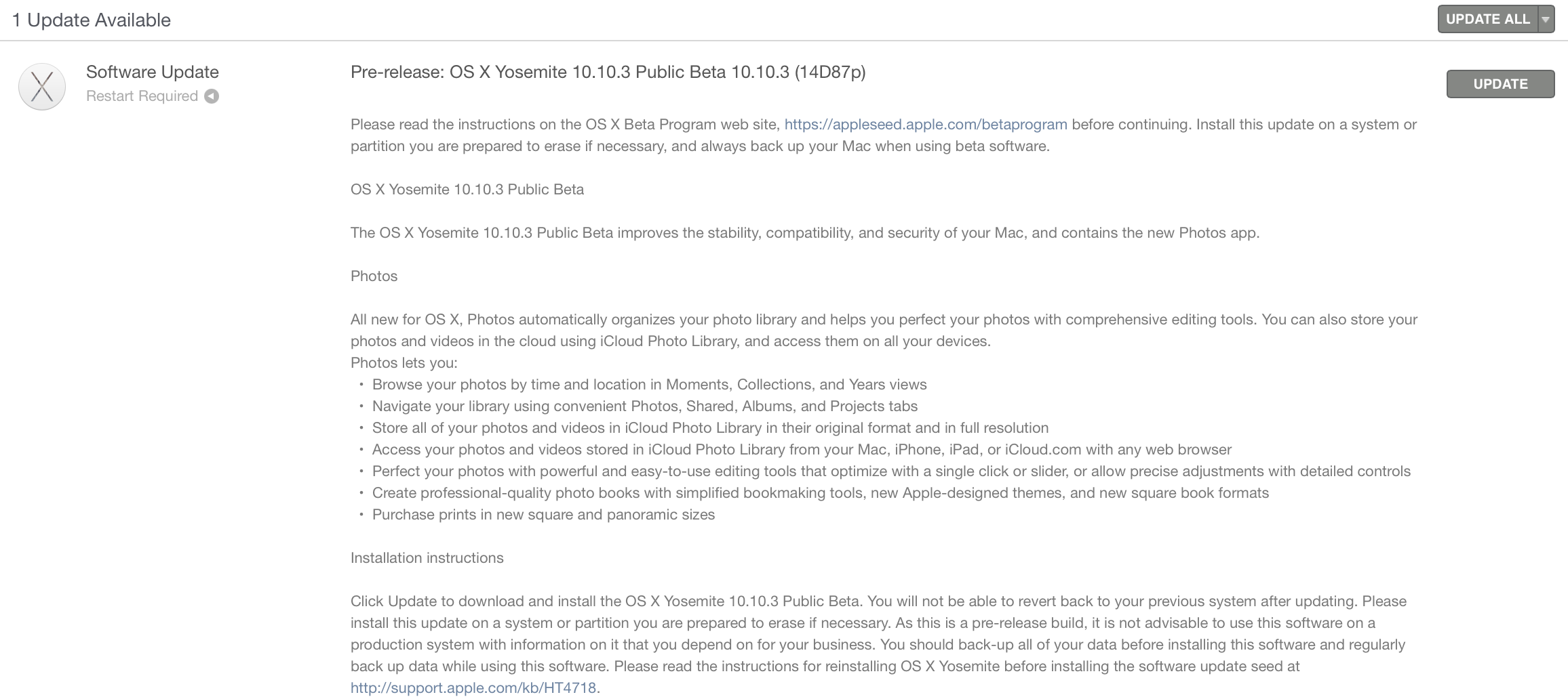 Apple today released the first Public Beta of the upcoming OS X Yosemite 10.10.3. The new release includes the iCloud-based Photos application for the Mac, new Emojis across the system, and simpler login to Google accounts for profiles with two-factor authentication enabled. This beta is labeled as build 14D87, which is the same as the second 10.10.3 beta for developers, which was released a week ago. The Public Beta is available in the Mac App Store Software Update tab for registered beta users. Apple plans to release the first Public Beta of iOS 8.3 in mid-March, according to sources. Thanks, DJ!