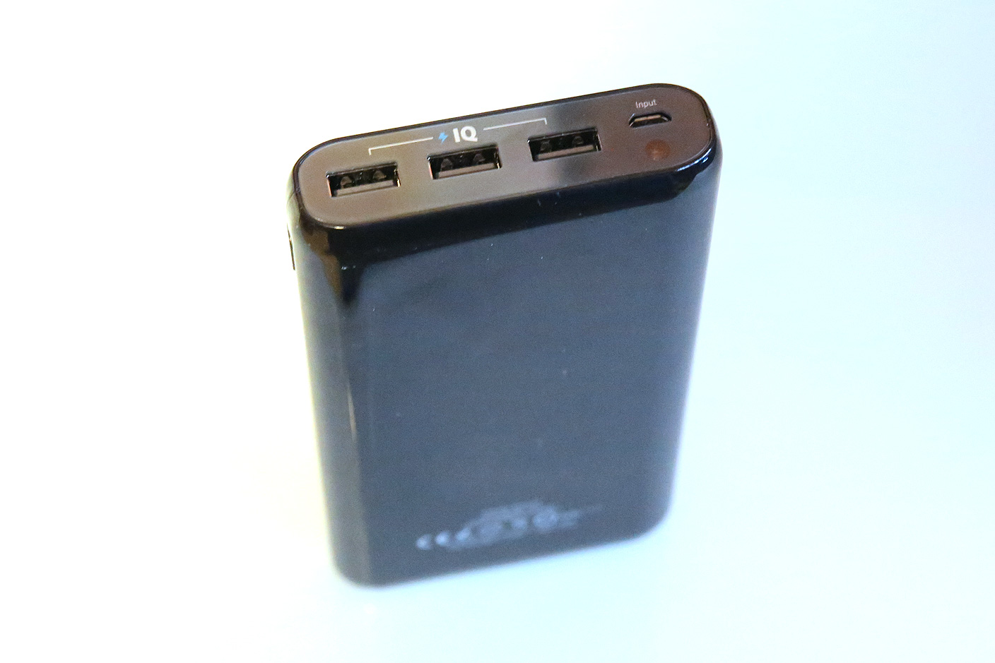 Another nice feature of Astro E7 is its fully automated power on/off system. The battery turns on automatically when a USB plug is connected, and off automatically when no plugs are connected. A small bar-shaped button on the edge near the USB ports is needed only to activate a tiny LED flashlight or to trigger the four blue power indicator LEDs on the top. The LEDs work reliably to indicate the fraction of power remaining during charging; you can notably recharge Astro E7 at up to 2-Amp speeds.