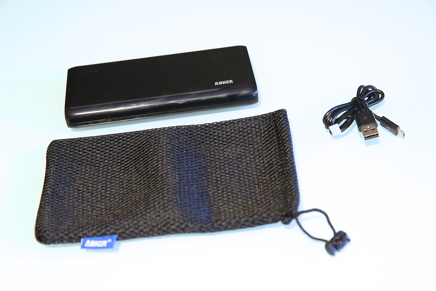 Measuring 6.5″ long by 3″ wide by 0.75″ thick, Astro E7 is only a little taller than the iPhone 6 Plus, but around three times thicker and at 1.1 pounds, roughly the weight of an iPad. The footprint makes it easy to toss in any bag, and the glossy plastic housing is actually really comfortable to hold, though as fingerprint-susceptible as one might expect from the material. Anker includes a nice mesh drawstring carrying bag and a micro-USB cable in the package.