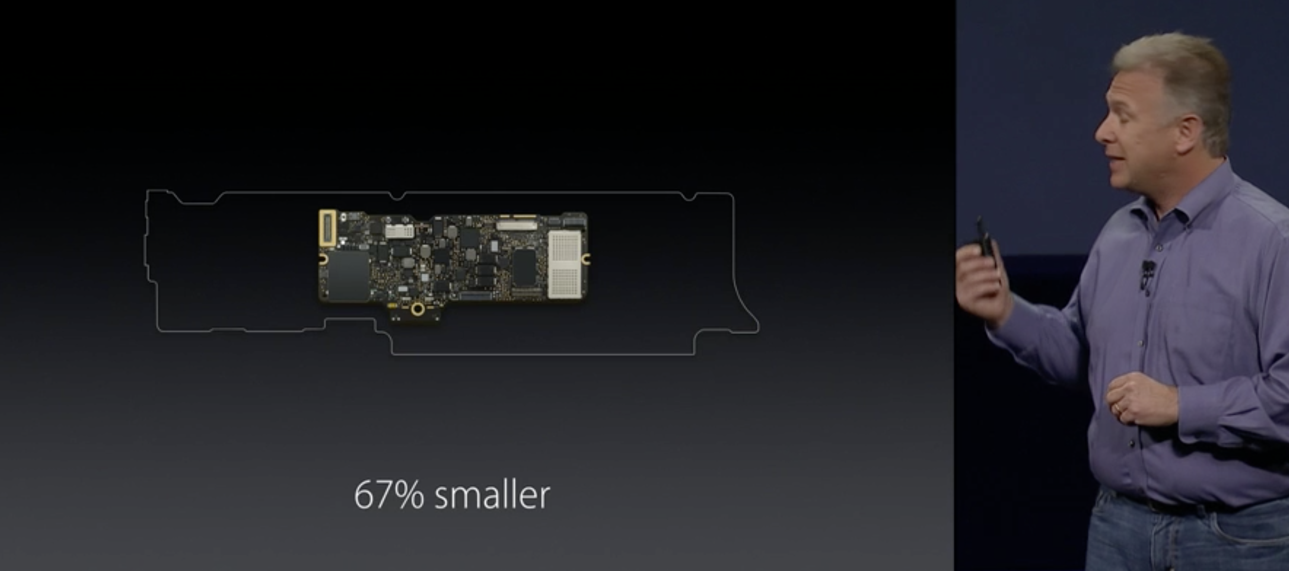 It’s the first fanless Mac notebook, with a miniaturized logic board only 1/3 the size of the prior 11″ MacBook Air, and most of the rest of the internal space occupied by batteries. The CPU is said to be a low-power Intel Core M processor, which can turbo-charge up to 2.9GHz in the 1.3GHz model, plus an Intel HD Graphics 5300 GPU. Apple promises 9-10 hour battery life depending on whether you’re using the web or watching iTunes videos. Apple says that it can “operate in silence.”