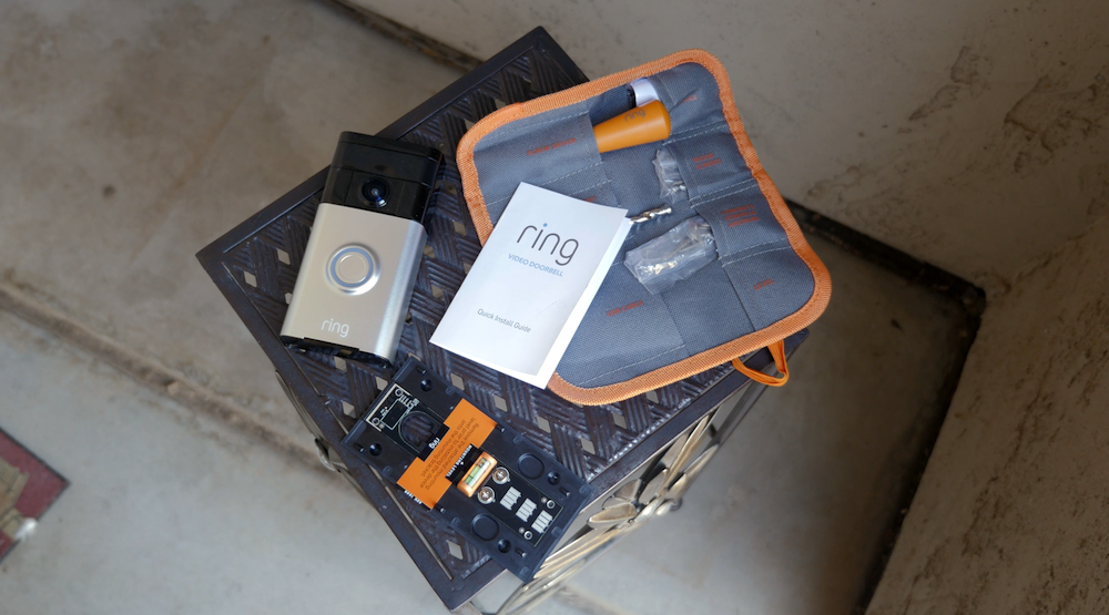 Inside of the box, everything you need to get Ring installed and setup is included. You’ll find a mounting plate, small quick start guide, and a toolkit with screws, a multi-bit screwdriver, caulking to seal up old holes, a drill bit… yeah like I said, everything you need to get it installed. Finally we have the Ring unit itself.