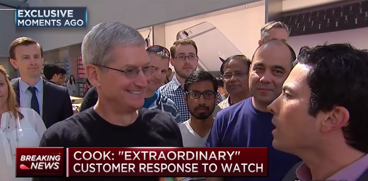 Tim Cook visited the Palo Alto Apple Store today to check out the Apple Watch buzz, as people around the world attend try-on appointments and (failed to) pre-order Apple Watch online. In an interview with CNBC, Cook said that customer response has been extraordinary and “orders are great”.