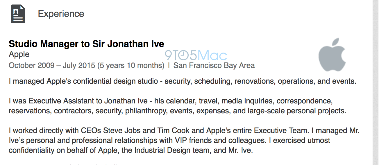 This means that Ive is shedding the entirety of his managerial duties with this new role, and the possibility of his assistant leaving raises the question of how involved Ive could be at Apple to no longer need a design studio manager or lead assistant. Of course, it is possible that Apple could simply have hired a replacement for Alexander, but the July 1st timing seems to indicate a planned departure.