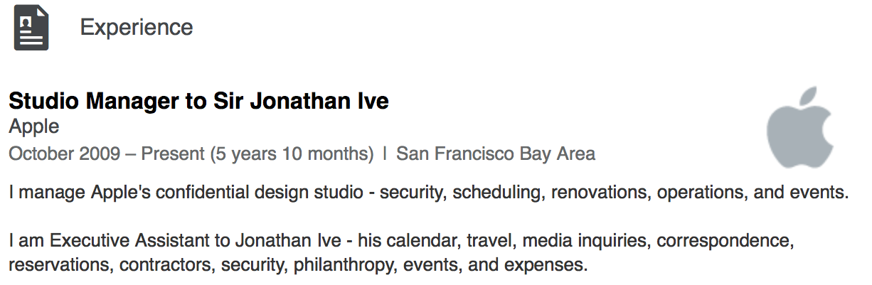 He clearly states he “was” Ive’s assistant and office manager, and that he finished this job in July 2015. After discovering this change on Alexander’ LinkedIn, we contacted him for comment, and received no reply. A day later, his only public-facing website was deleted and his LinkedIn biography was mostly reverted to its state prior to July 1st: