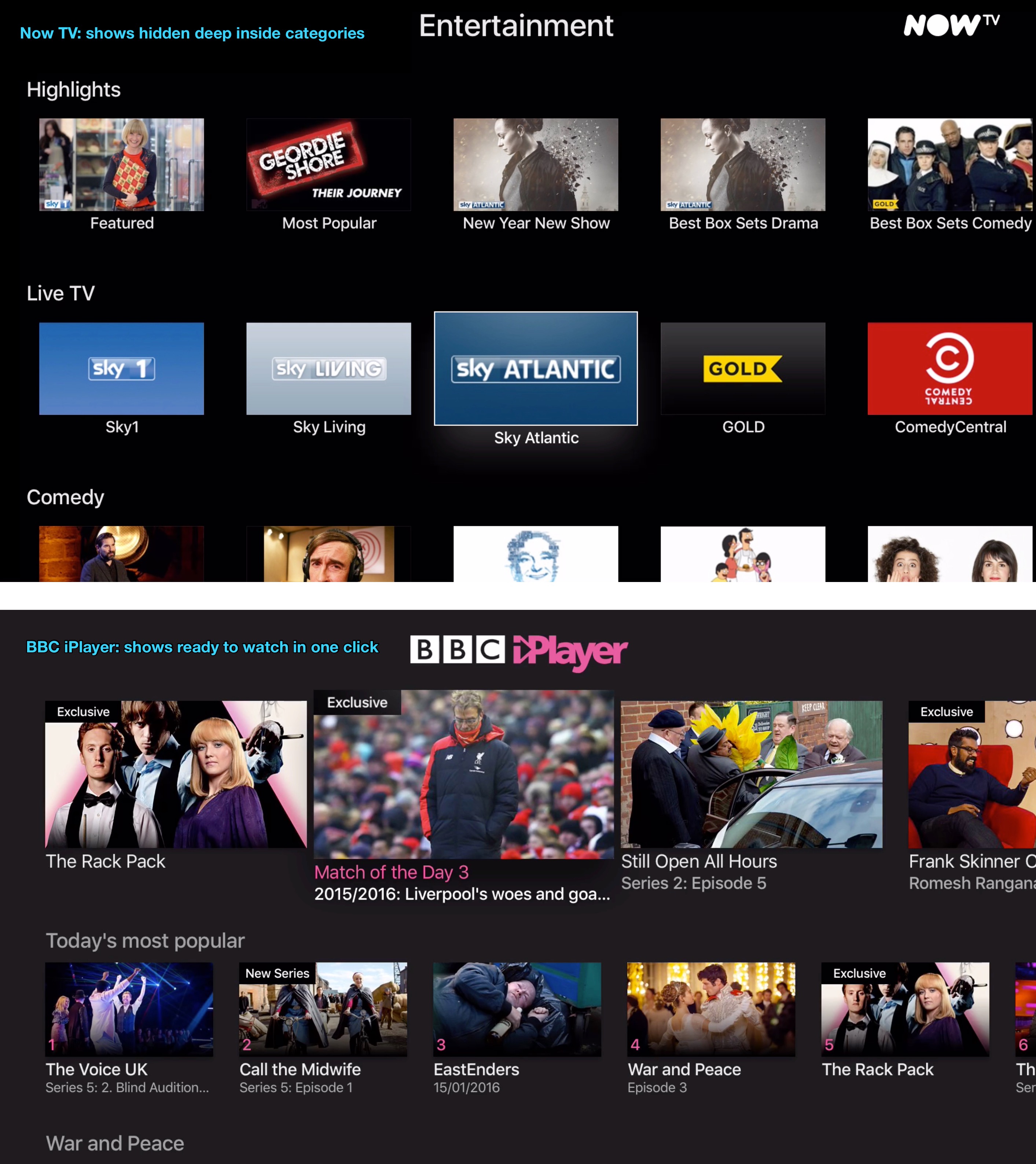 For my personal Apple TV watching habits, I have to contrast the user experience between Now TV and iPlayer. iPlayer is the good citizen here. It has rich media visuals with bright colours signifying each channel’s section. You can also jump straight to live broadcasts from the same view. There are also several category options to further refine and search for something interesting to watch. Most importantly, there is content to watch available instantly on application launch.