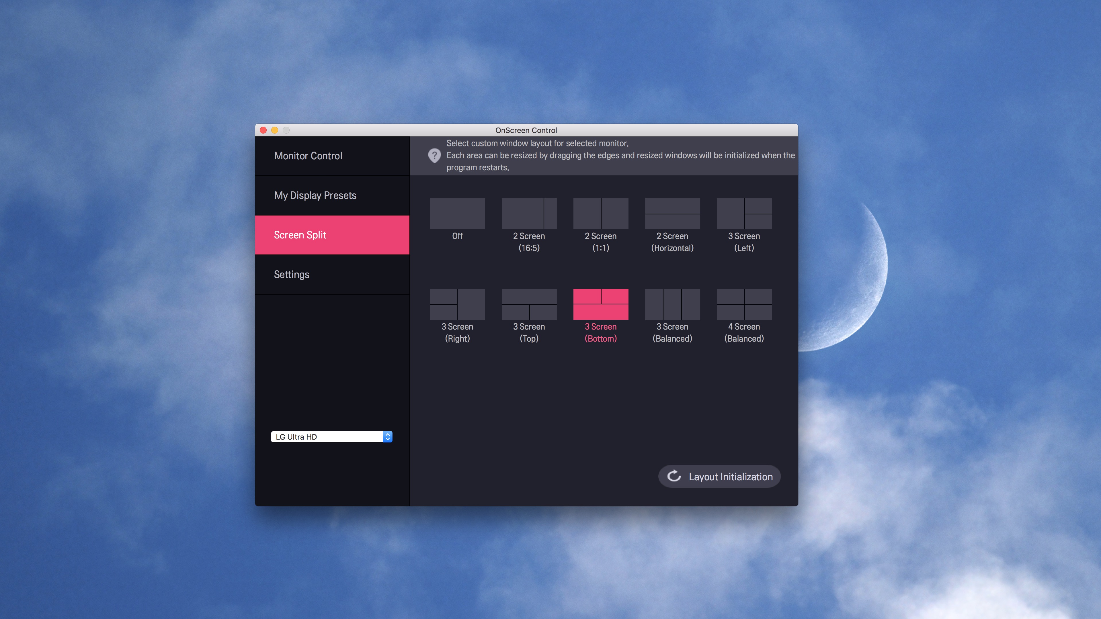 If you don’t need to run two different input sources simultaneously, you may be interested in taking advantage of LG’s Split Screen 2.0 feature, which is a part of its OnScreen Control software suite. Split Screen 2.0 allows users to divvy up the screen to display multiple apps on screen at once. In all, there are 14 different display options, including a picture-in-picture mode. I wasn’t able to get PIP working with version 1.3.6 of the Mac’s OnScreen Control software, but perhaps version 1.3.9 for Windows includes the feature. I’ve reached out to LG about this and am awaiting a response.