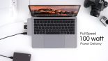 The charging passthrough capabilities of the HyperDrive allow for up to 100W power delivery via the hub’s Thunderbolt 3 port. That allows you to charge a MacBook Pro at full speed through HyperDrive while using it, delivering the maximum 61W power to the 13″ MacBook Pro or 87W to the 15″ MacBook Pro.