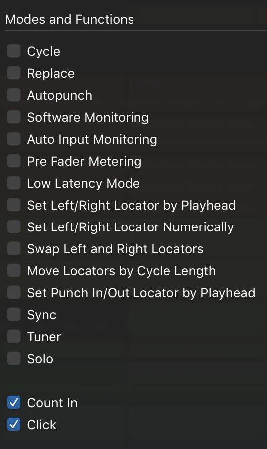 Count In and Metronome: Right Click the Control Bar to open the Control Bar Configuration Settings and ensure you have the Count In and Metronome options checked off. This will display the toggle on/off options for both in your Control Bar. It looks like this.