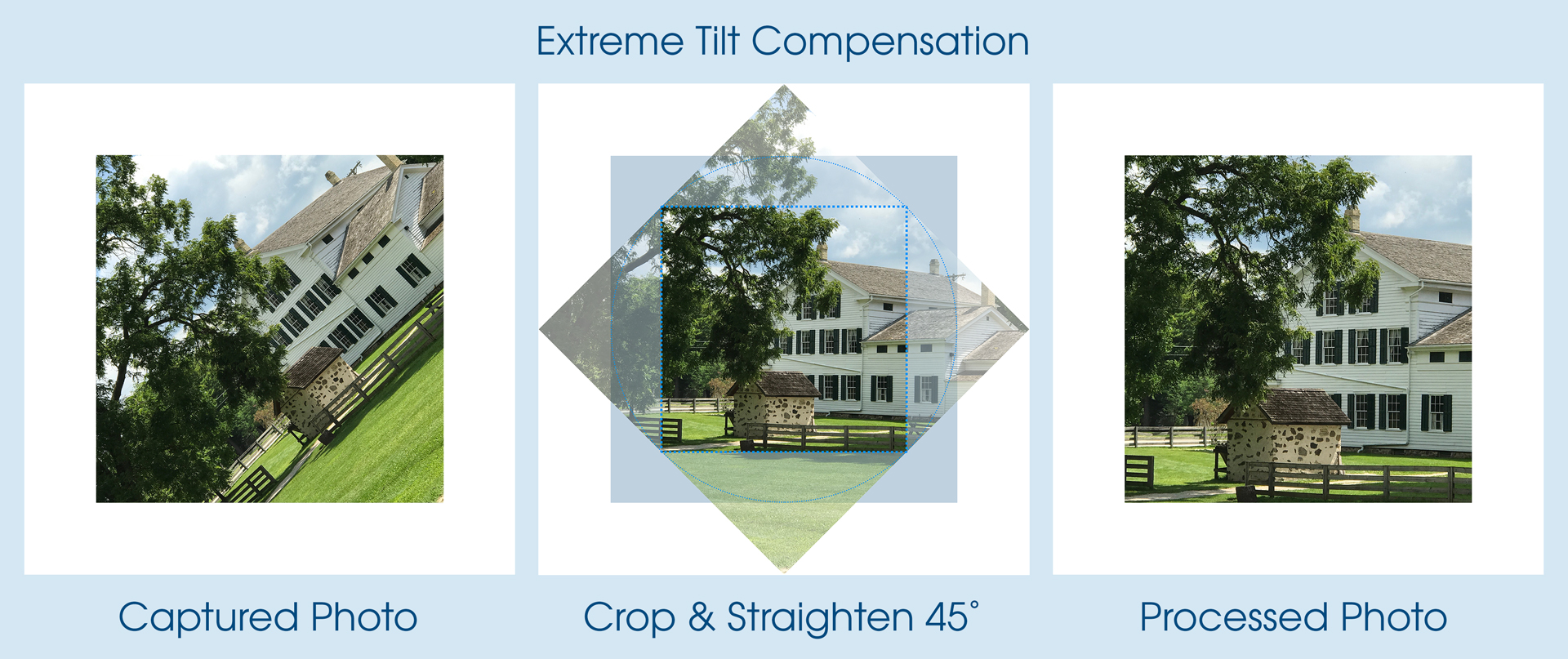 The diagram above shows how an image sensor with similar resolution capabilities to cameras Apple is shipping today could comfortably produce a 5-megapixel image even in extreme cases of a 45-degree tilt correction. This is thanks to the square aspect ratio, which is very forgiving to reframed images.