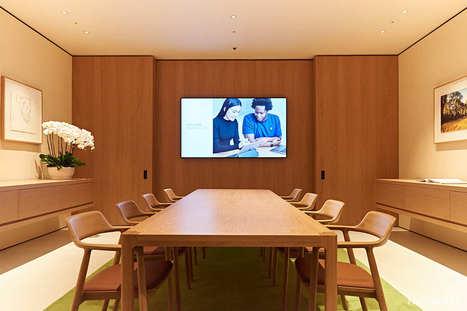 In a media preview held this week ahead of the store’s official grand opening, Hypebeast Korea and CNET Japan shared further images of the new space, detailing the building’s lower level meeting area called the boardroom, which features wooden Maruni chairs similar to those found at Apple Park’s Visitor Center, and Apple Park themed decor. The boardroom is also outfitted with custom furniture designed to hold and charge Apple’s entire line of iPhones, iPads, MacBooks, and Apple Watches.