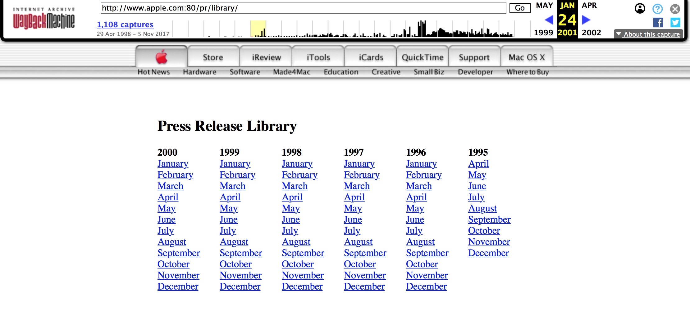 Apple’s unique contribution to an official timeline is the context it can provide to properly communicate its story and values. A comprehensive, searchable, and detailed timeline of Apple’s products and company announcements is at the heart of an archive. If thoughtfully designed, such a library could become the definitive hub for all Apple reference material.