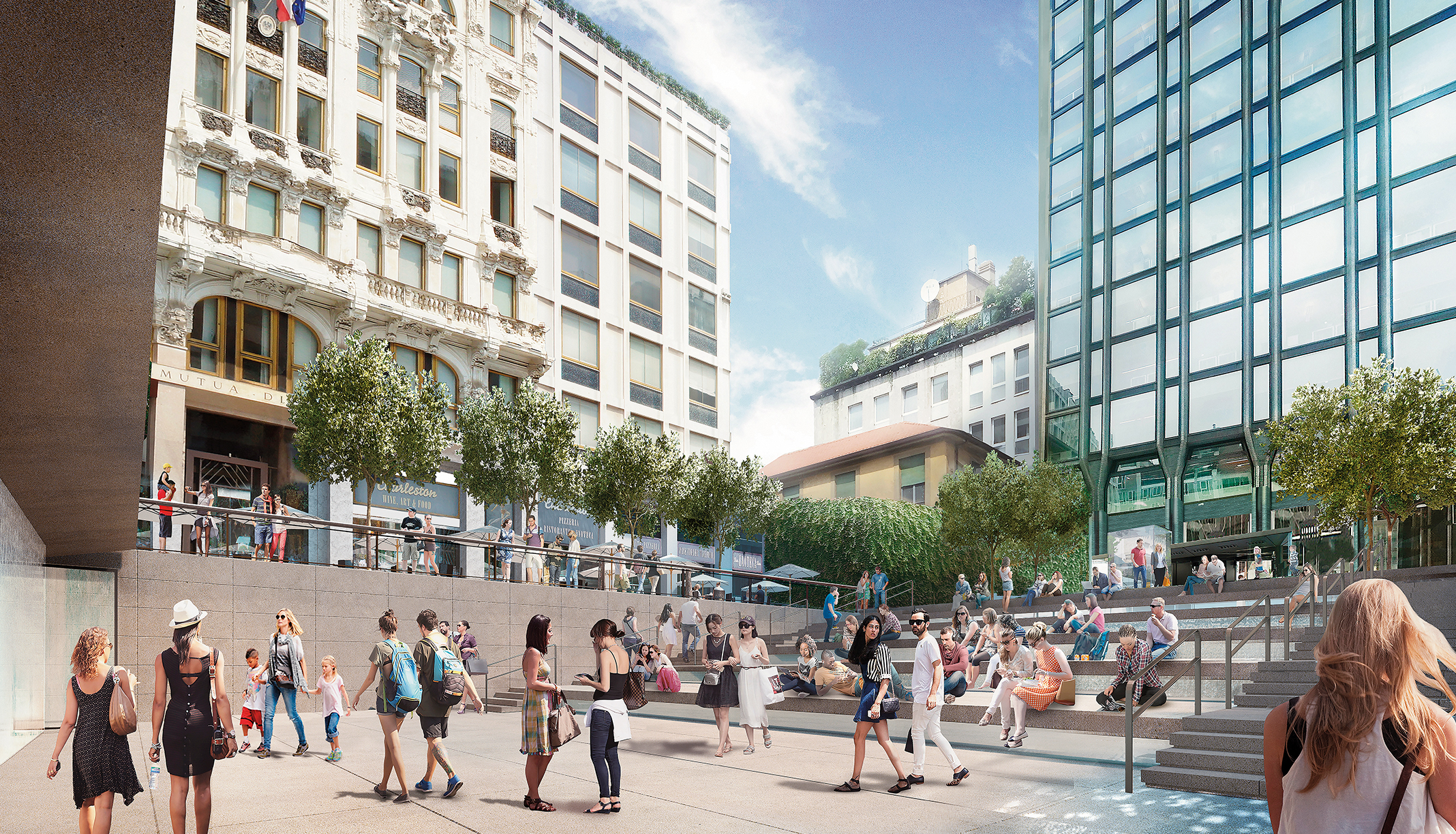 Both Piazza Liberty and the underground space that will house Apple’s sales floor are culturally signifiant to Milan. The plaza itself was named after the former historic Hotel del Corso, whose facade was moved to the north side of the square in 1955. Elsewhere around the plaza are buildings dating back as far as 1836. The head of the square is capped by the Torre Tirrenia, an 11-floor, modernist tower stretching upward in stark contrast to its quieter surroundings.