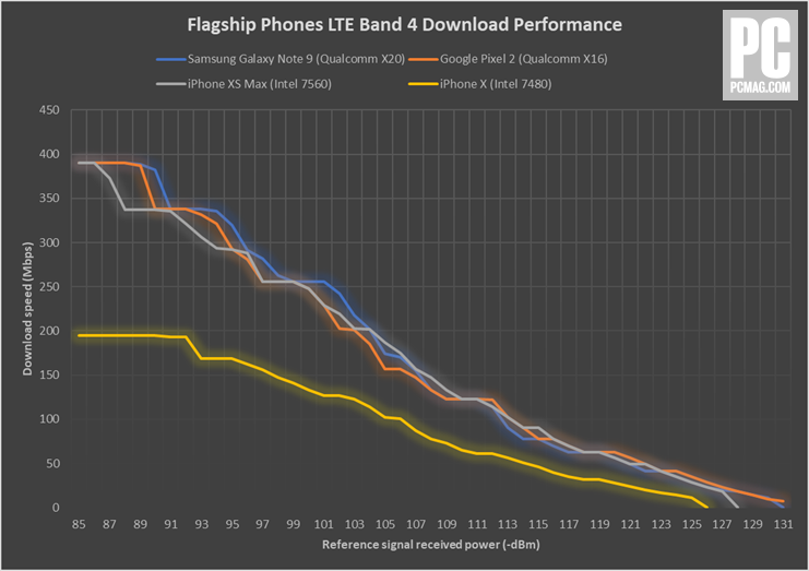 The tests pitted the iPhone XS Max against last year’s iPhone X with an Intel modem, as well as the Qualcomm-powered Galaxy Note 9 and Google Pixel 2.