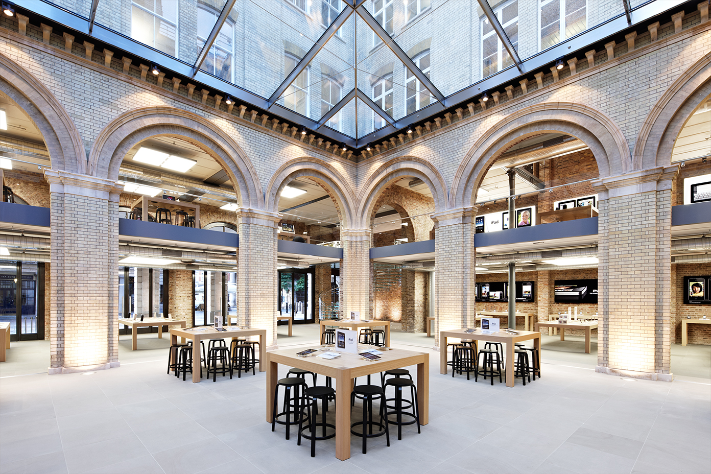 Inspiration for the store’s transformation may be drawn from Apple Buchanan Street in Glasgow. Like Covent Garden, the store occupies a historic building with exposed stone walls throughout its interior and featured a spiral glass staircase. The store was extensively remodeled in 2016, with Apple replacing nearly every fixture and surface not original to the building, including the stairs.