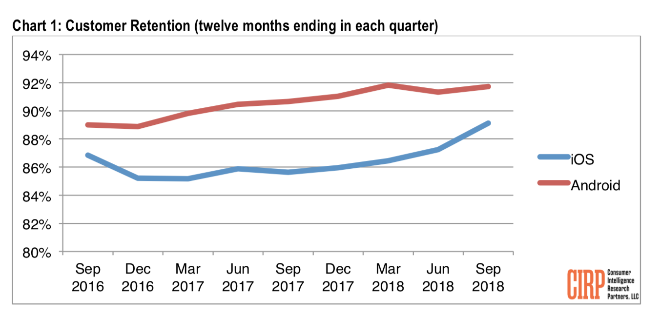 CIRP says that its research shows Android has a 92 percent loyalty rate, compared to the 89 percent loyalty rate of iOS as of September of 2018. The smartphone loyalty numbers have fluctuated slightly over the last three years, but Android and iOS are both currently at their highest-ever points.