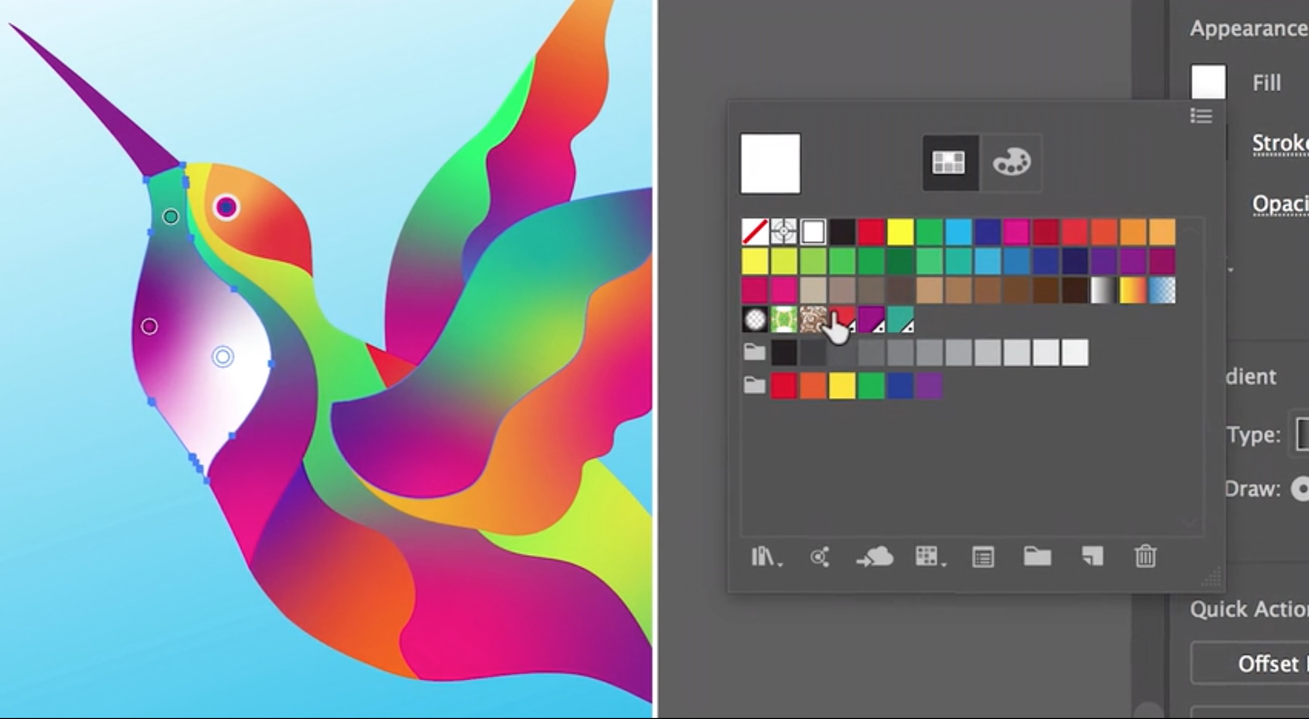 Illustrator CC: Freeform gradients allow points of color to be placed and turned into complex color blends. Global Edits can change multiple objects across artboards simultaneously.