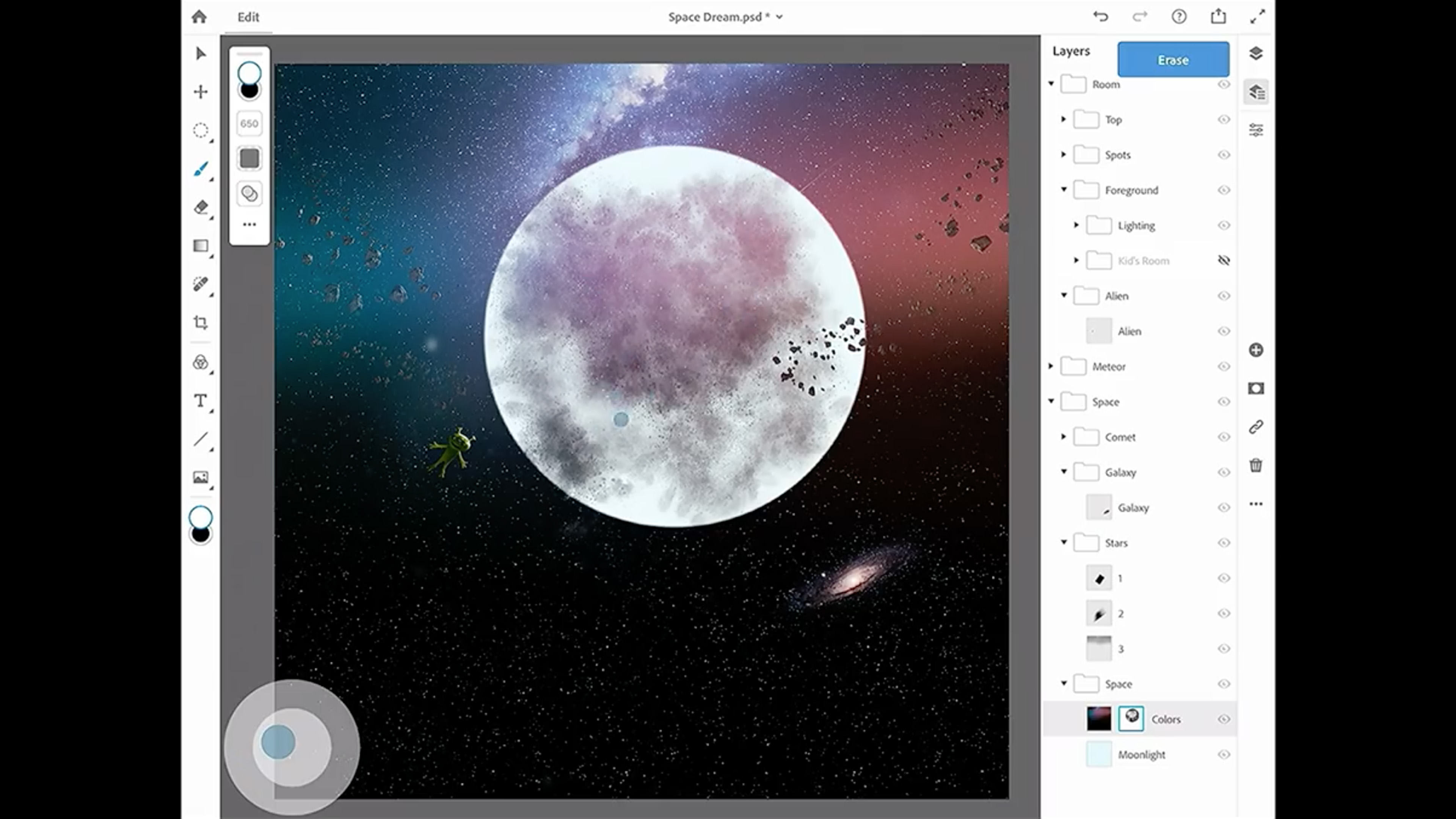 Today, the touch modifier is working in concert with the Apple Pencil to provide added utility. Pressing the button while drawing turns the Pencil into an eraser. Across the application, Apple Pencil support seems robust to the point that I wondered if it would be a requirement for Photoshop. Lyell says that users without a Pencil or who prefer to use their fingers for editing will have no problems using the app.